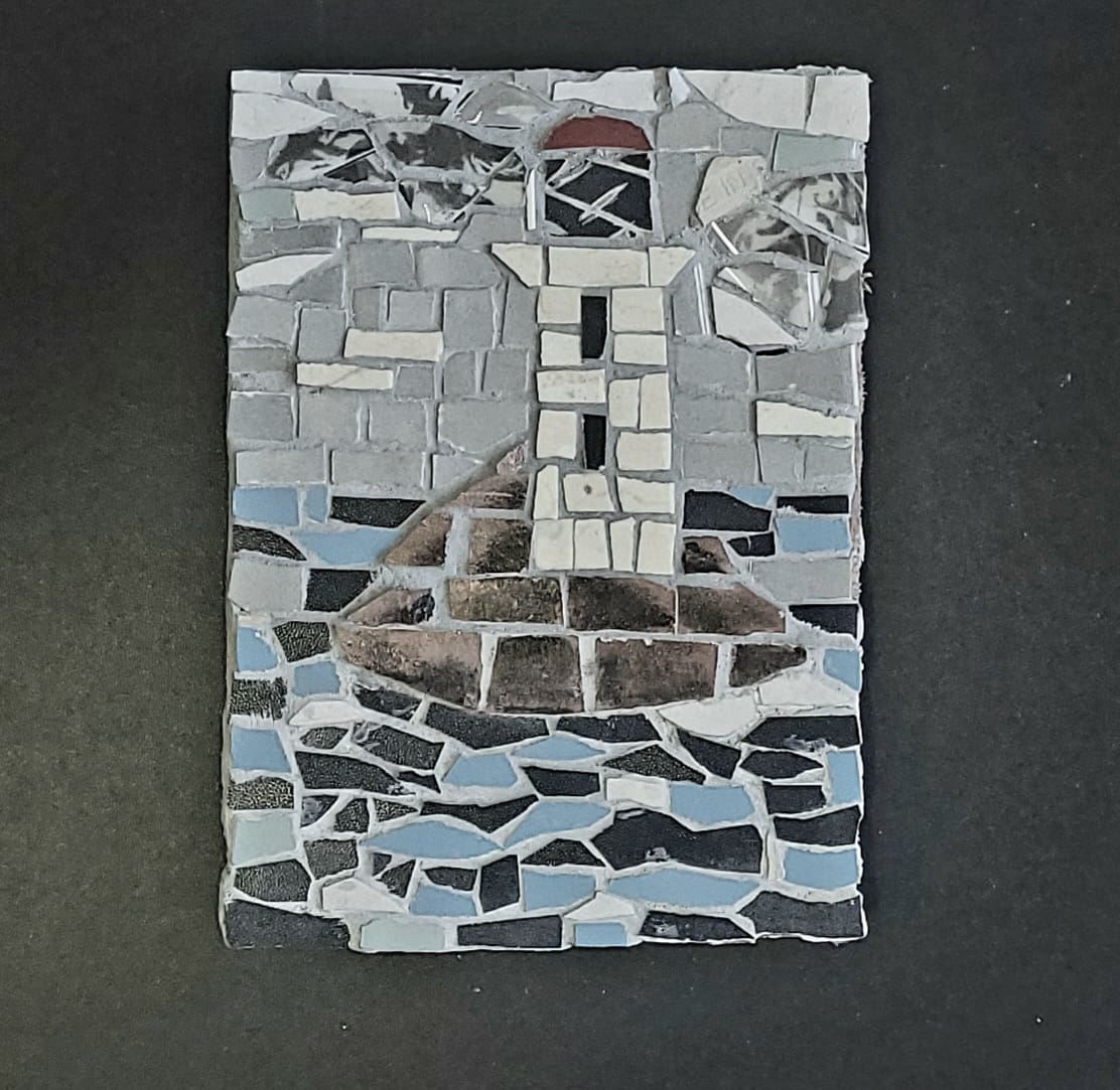 Ceramic tile crafted mosaic mounted on wooden backing. Piece measures 20 x 15 cm