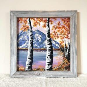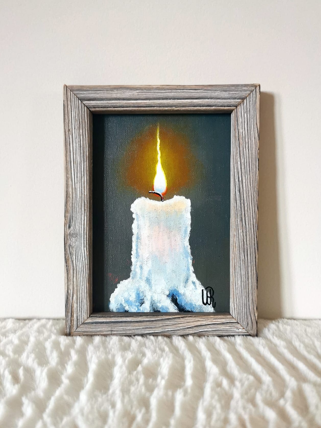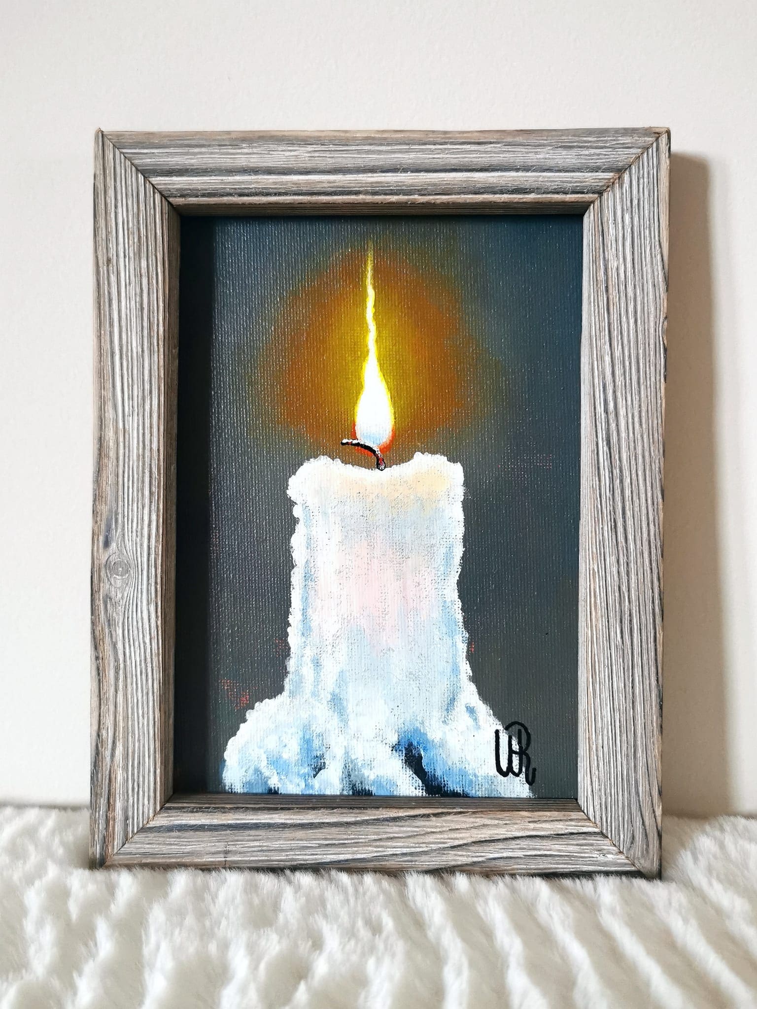 One of my favourites things to paint: candles. The painting will come framed and ready to hang. The frames are crafted by me and my husband using recycled wood, burnt and painted, cut to measure to create this rustic frames, each one being unique