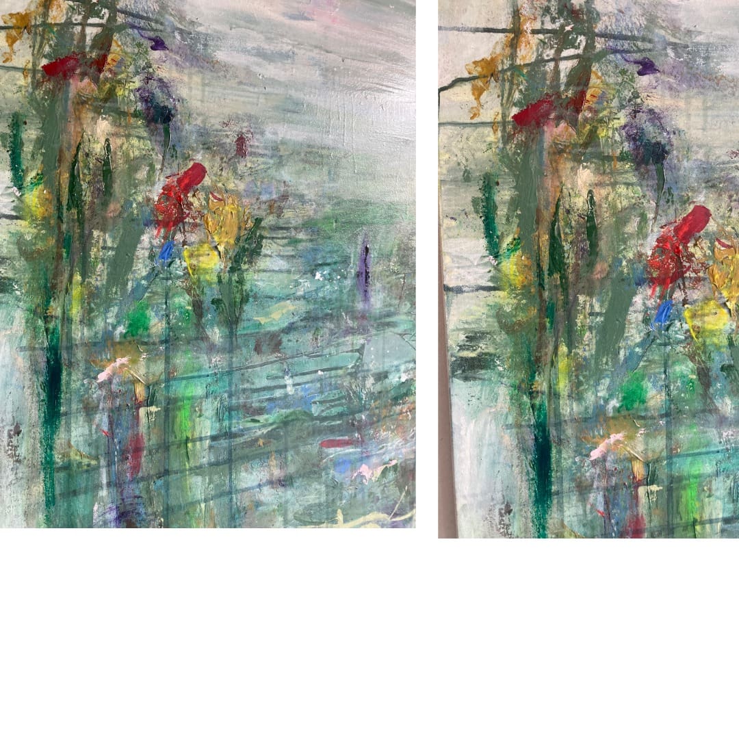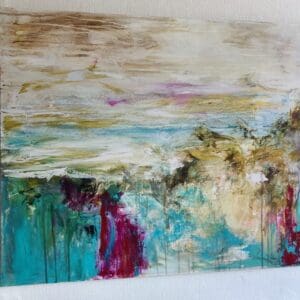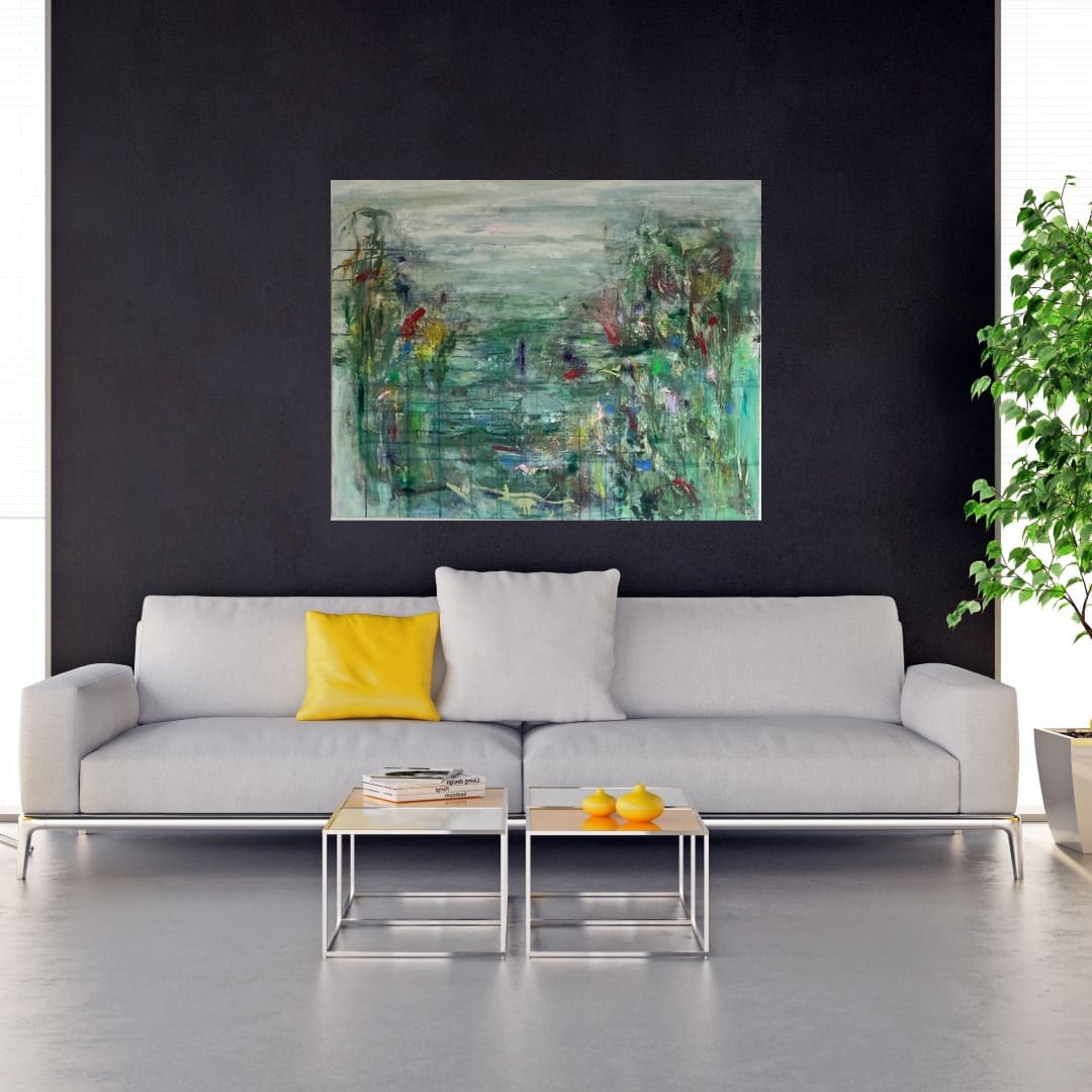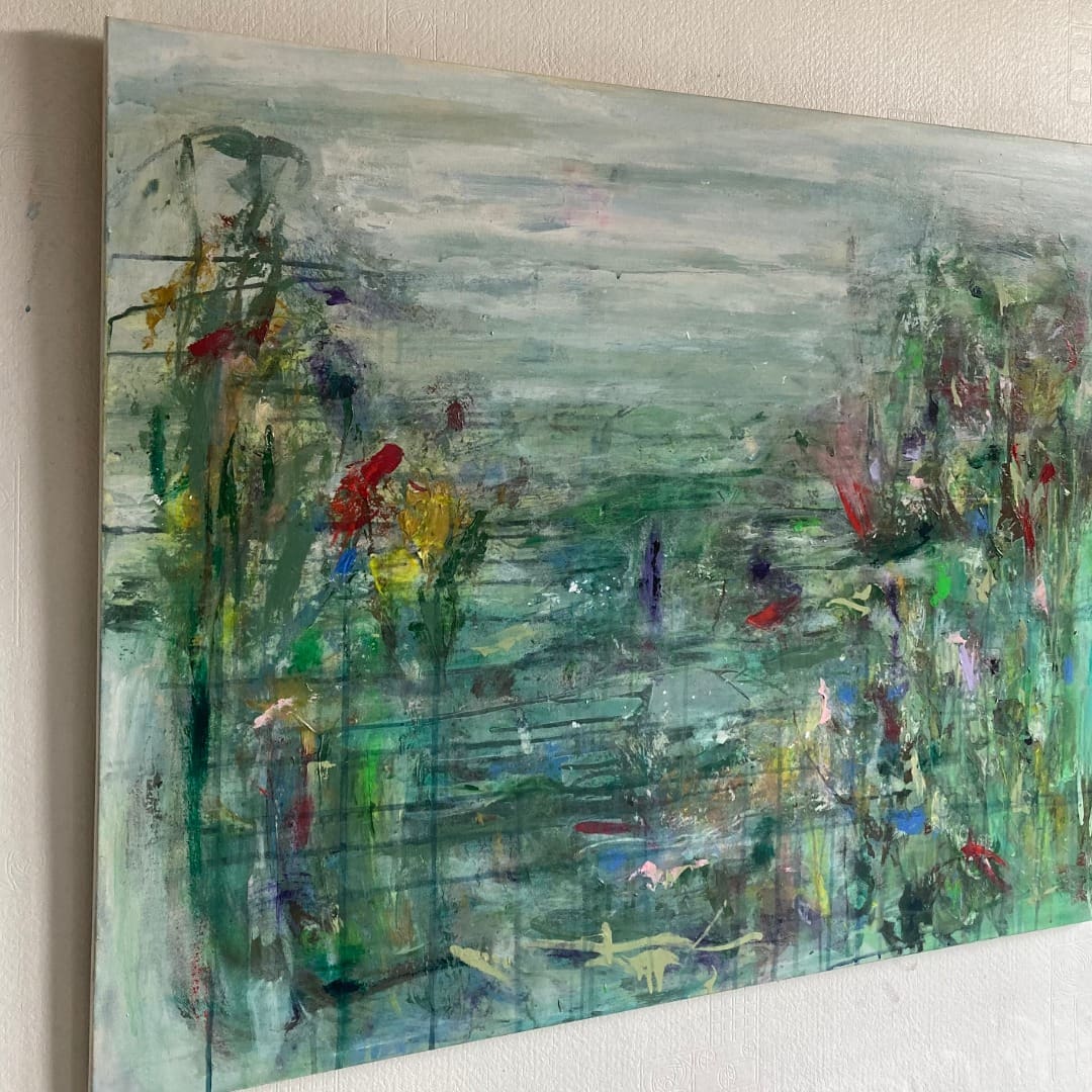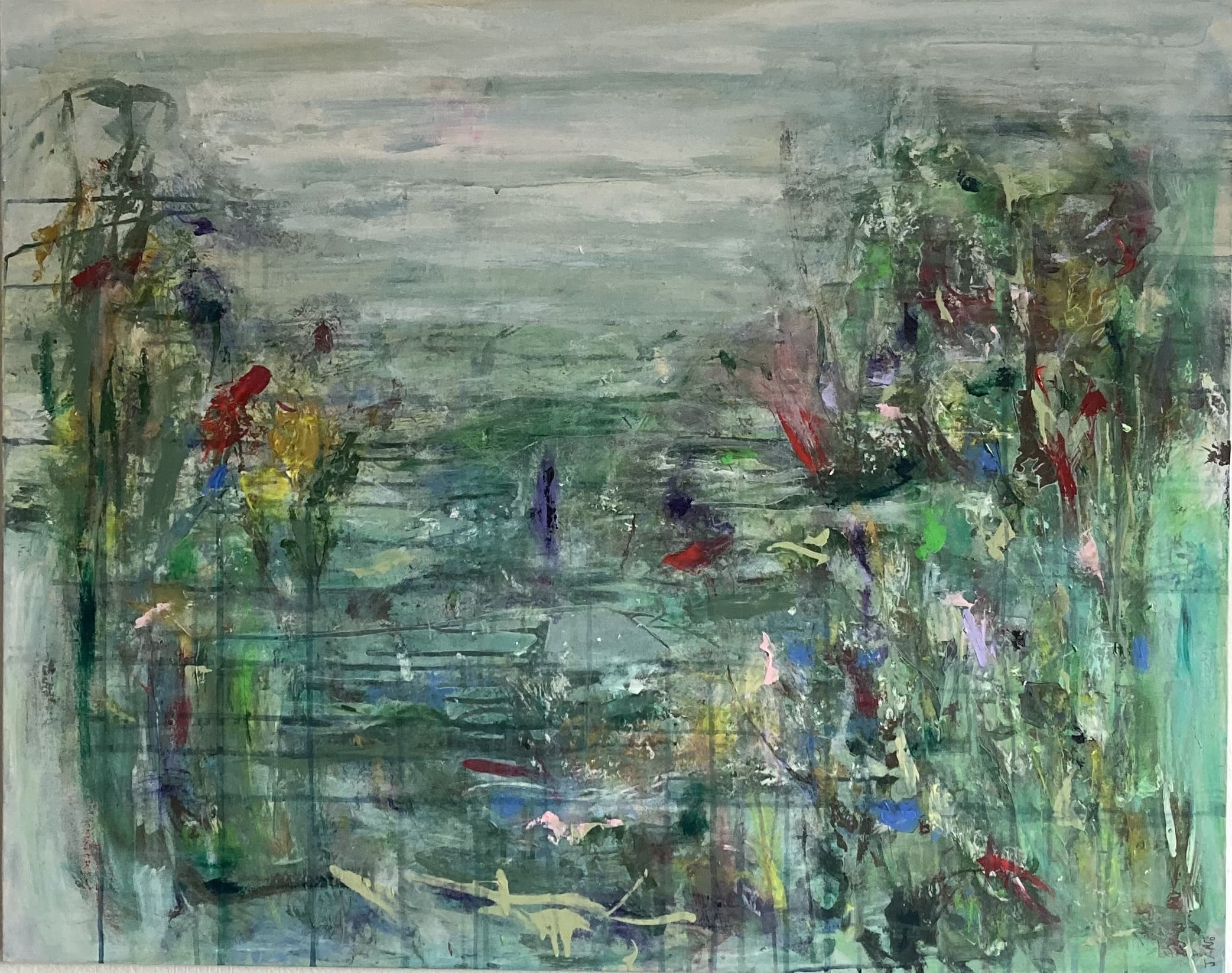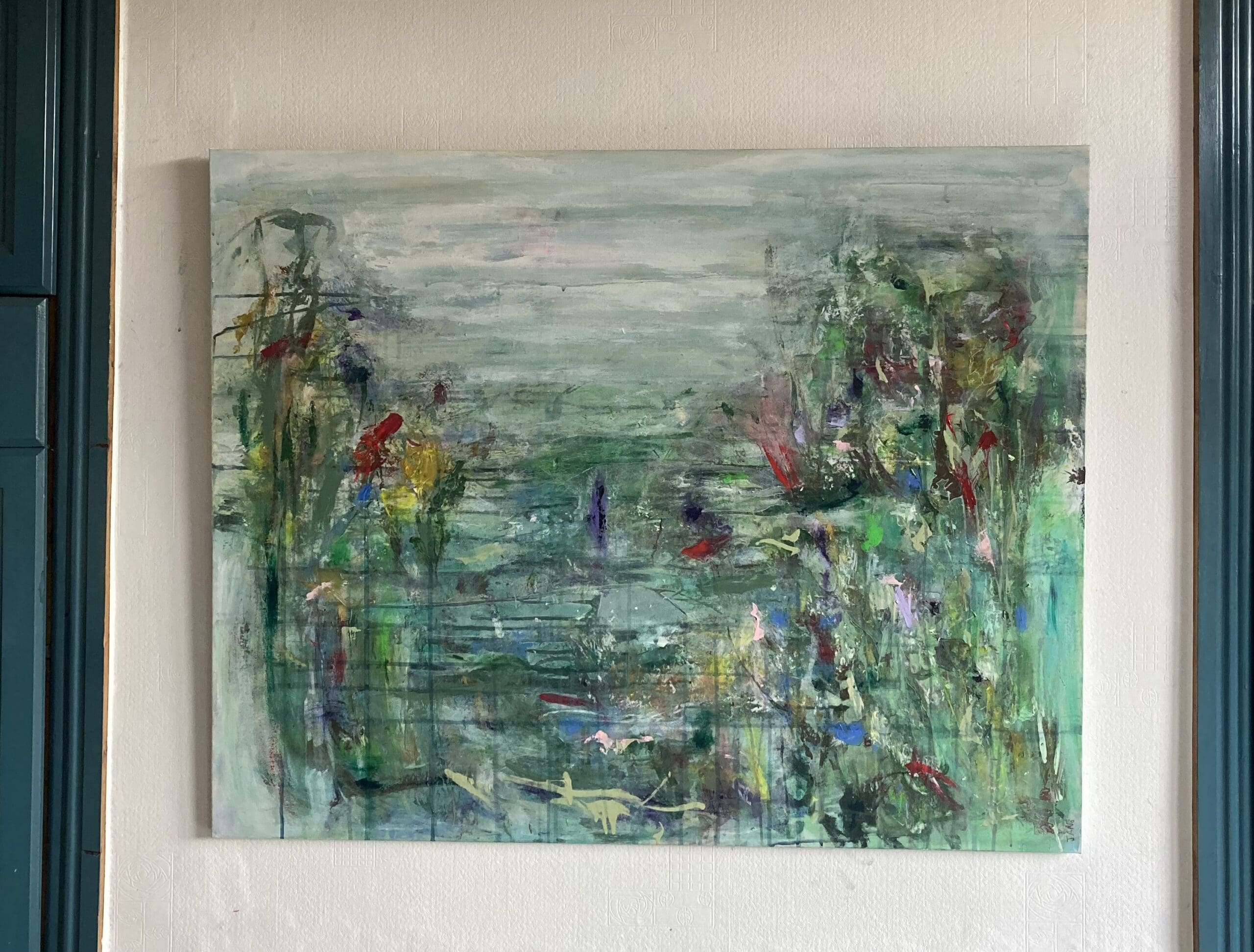 This painting by Jan O’Sullivan immerses the viewer in a lush, abstract landscape dominated by rich greens and deep blues. Expressive brushstrokes create a textured surface, evoking dense foliage and reflective water. Vivid accents of red, yellow, and purple punctuate the composition, drawing the eye through layers of color and movement. The upper section hints at a hazy sky, contrasting with the vibrant energy below.