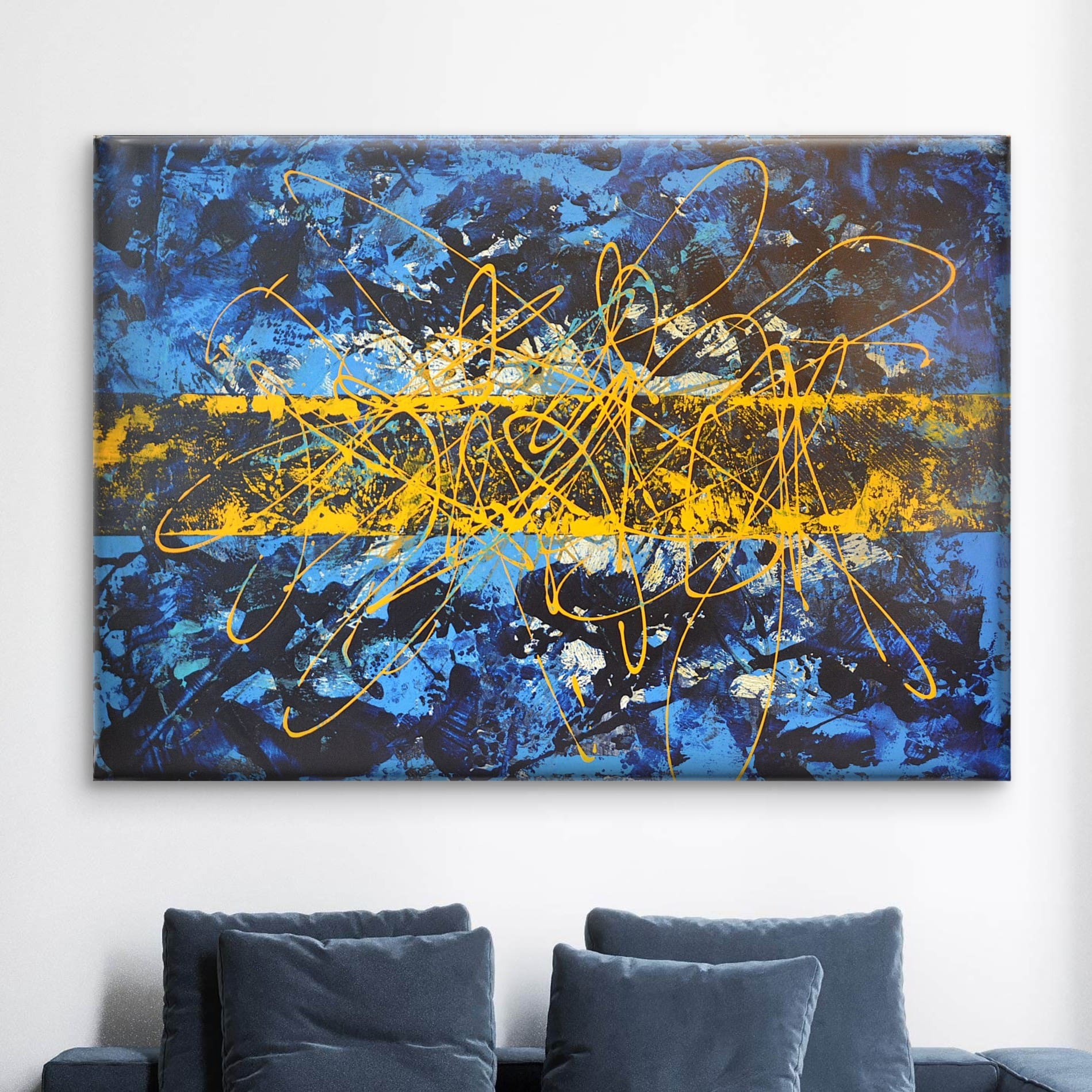 All my paintings are unstretched: You’ll receive the artwork rolled in a tube. You can conveniently get it framed at a nearby art shop or explore the option of standard market frames; it will be the most affordable and easy way for you to get a large canvas.