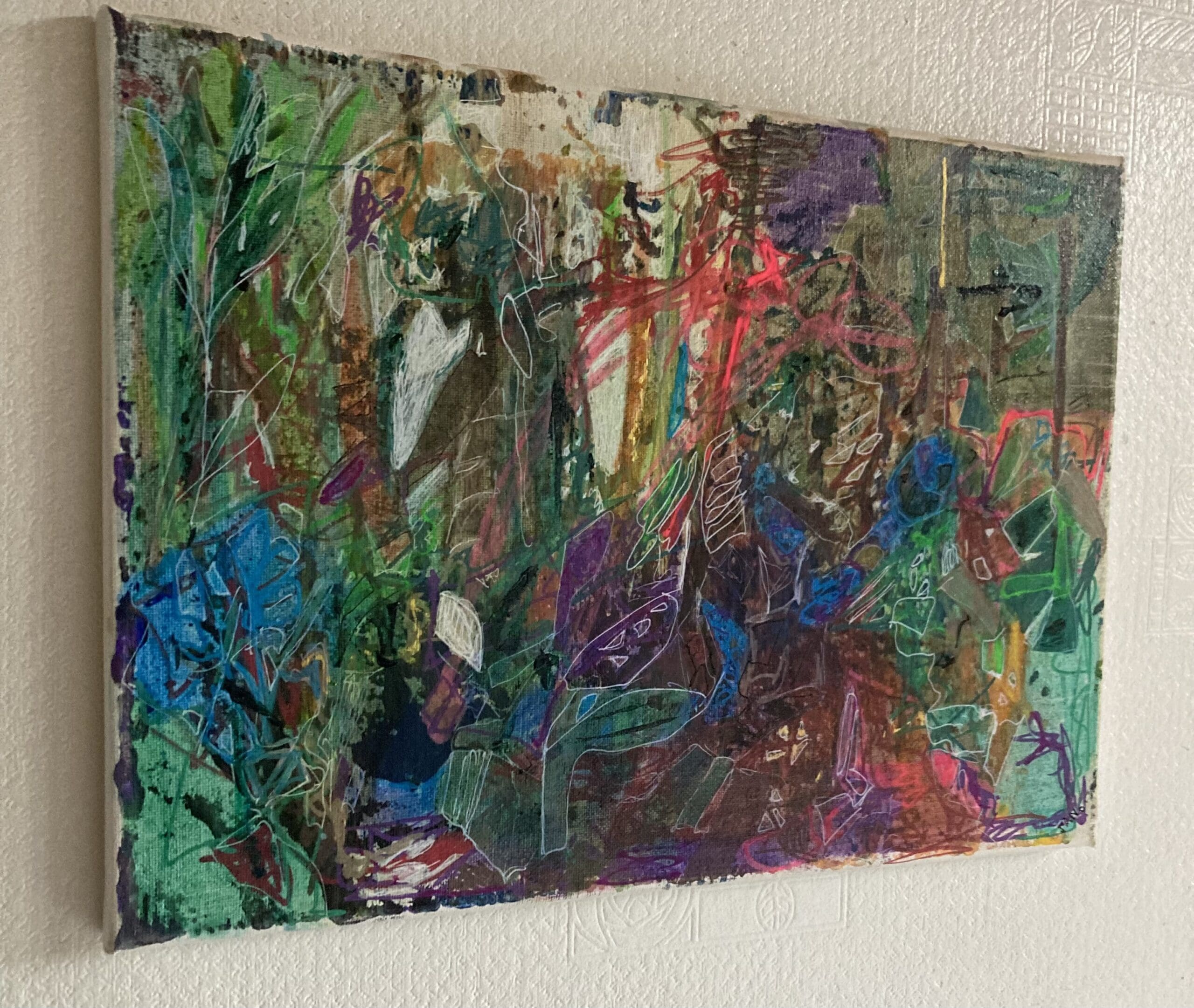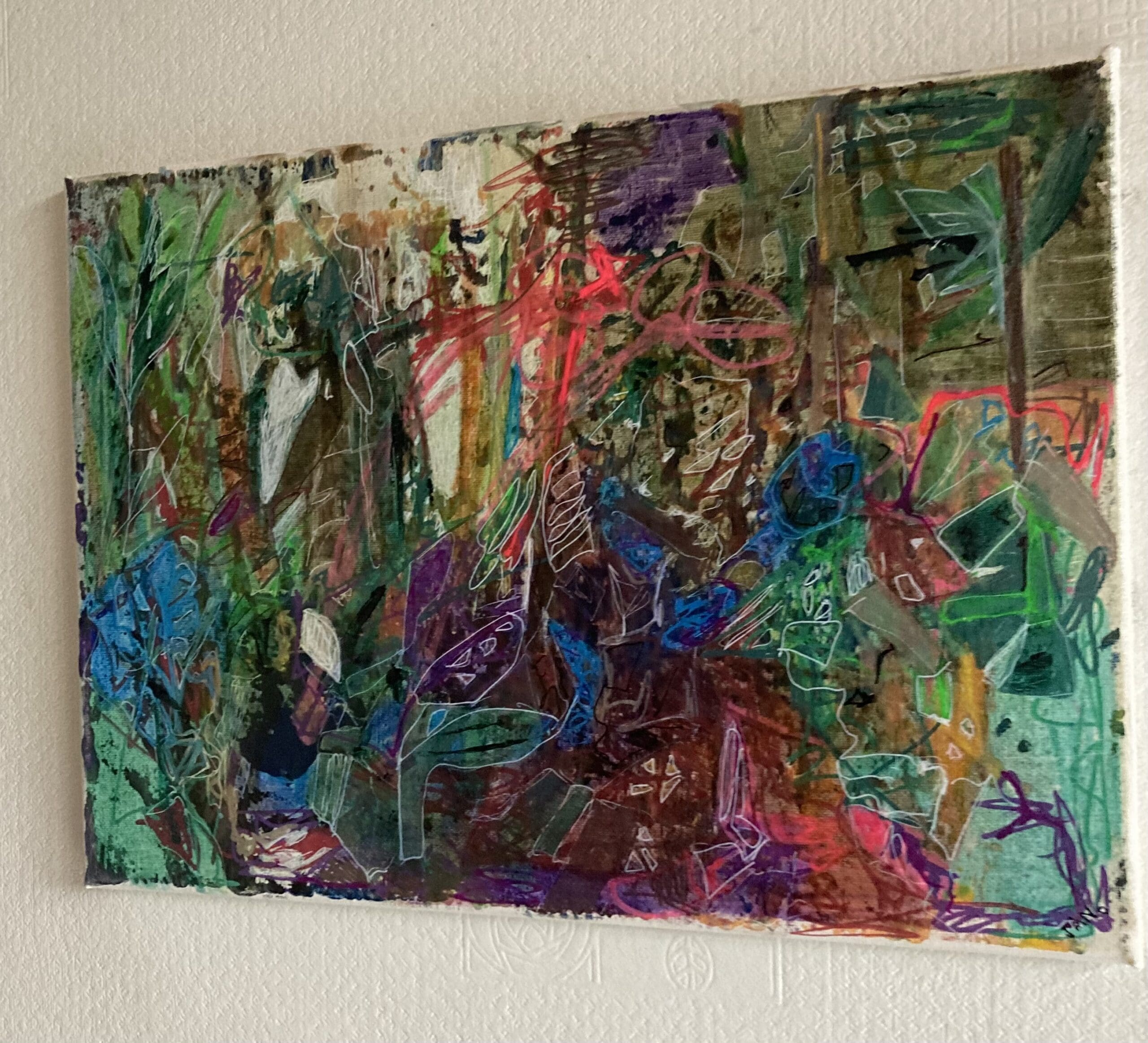 An abstract artwork inspired by the Dublin forest, Pine forest, with a colourful twist. Bright and with a dark depthness to it, this artwork will shine in your space. Canvas on board, framed in a deep white wooden tray frame. Photos in frame coming soon, or contact me and I can WhatsApp them to you.