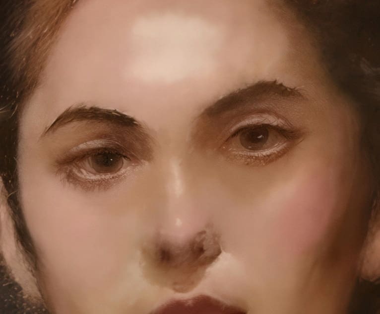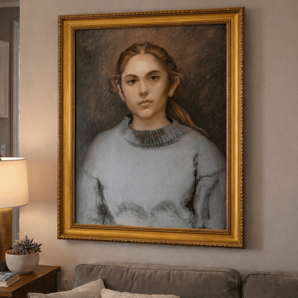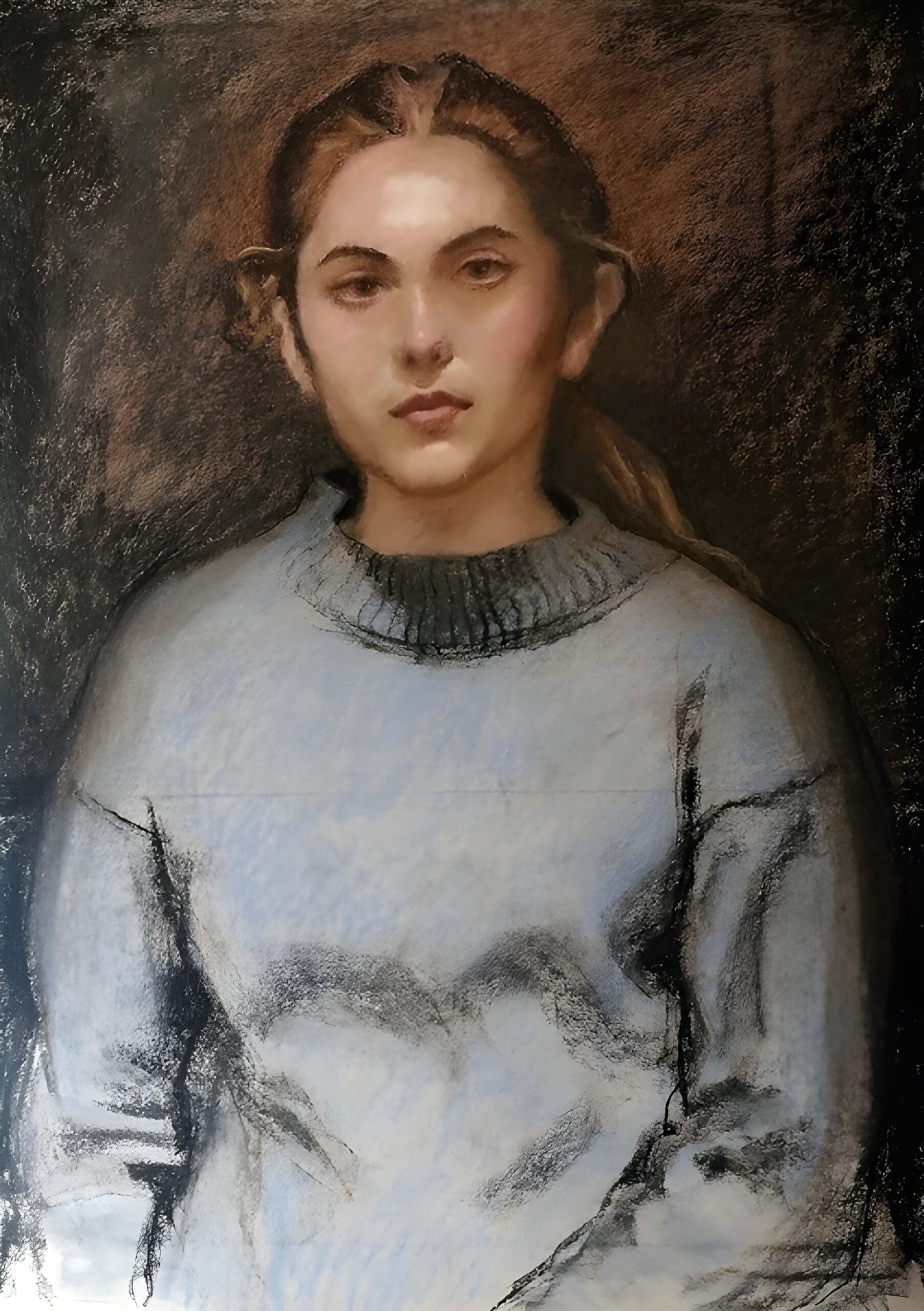 Beneath a muted gray surface, this portrait reveals a quietly resolute presence—a young woman poised with gentle calm. The subtle warmth of her skin blends with the soft illumination on her face, while her long brown hair, drawn back in an unassuming style, frames a thoughtful gaze. Her light blue sweater, rendered with delicate attention to the knitted patterns at the collar and cuffs, adds a touch of serenity that contrasts with the textured darkness behind her. The interplay of light and shadow, captured through restrained conte chalk strokes, invites a moment of contemplation—an intimate glimpse into a calm, reflective spirit captured in stillness.