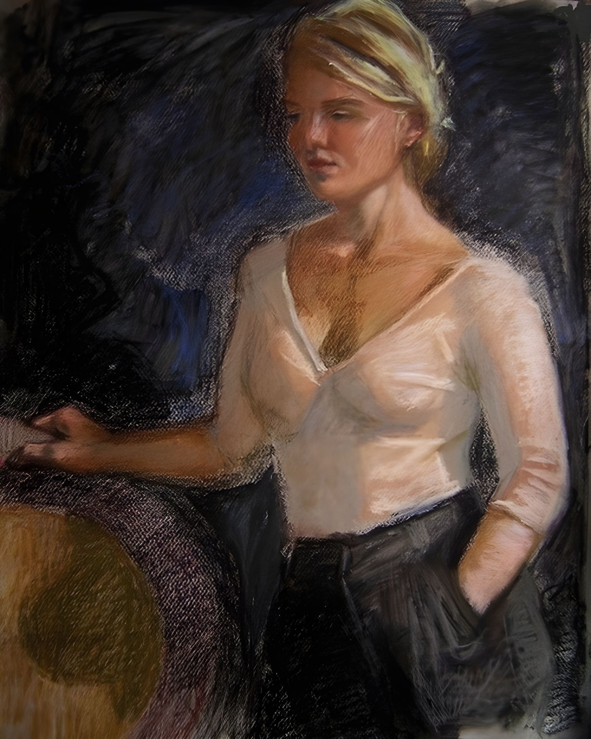 A woman is shown in three-quarter view, one hand on a antique chair, the other in her pocket. Soft light highlights her blonde hair and light top against dark trousers. The dark background sharpens the focus on her figure. Created with oil pastel thinned by turpentine in the early stages, the portrait blends soft and textured strokes of pastel to capture form and light from life.