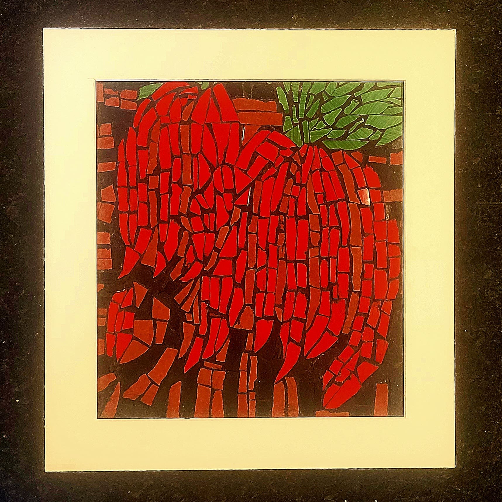High glaze ceramic mosaic mounted on wooden backing board measuring 28 x 26 cm envisaged to uplift a kitchen ideal to inset into existing tiles or decorate a dull wall area. Light reflections from tiles really bring this piece to life