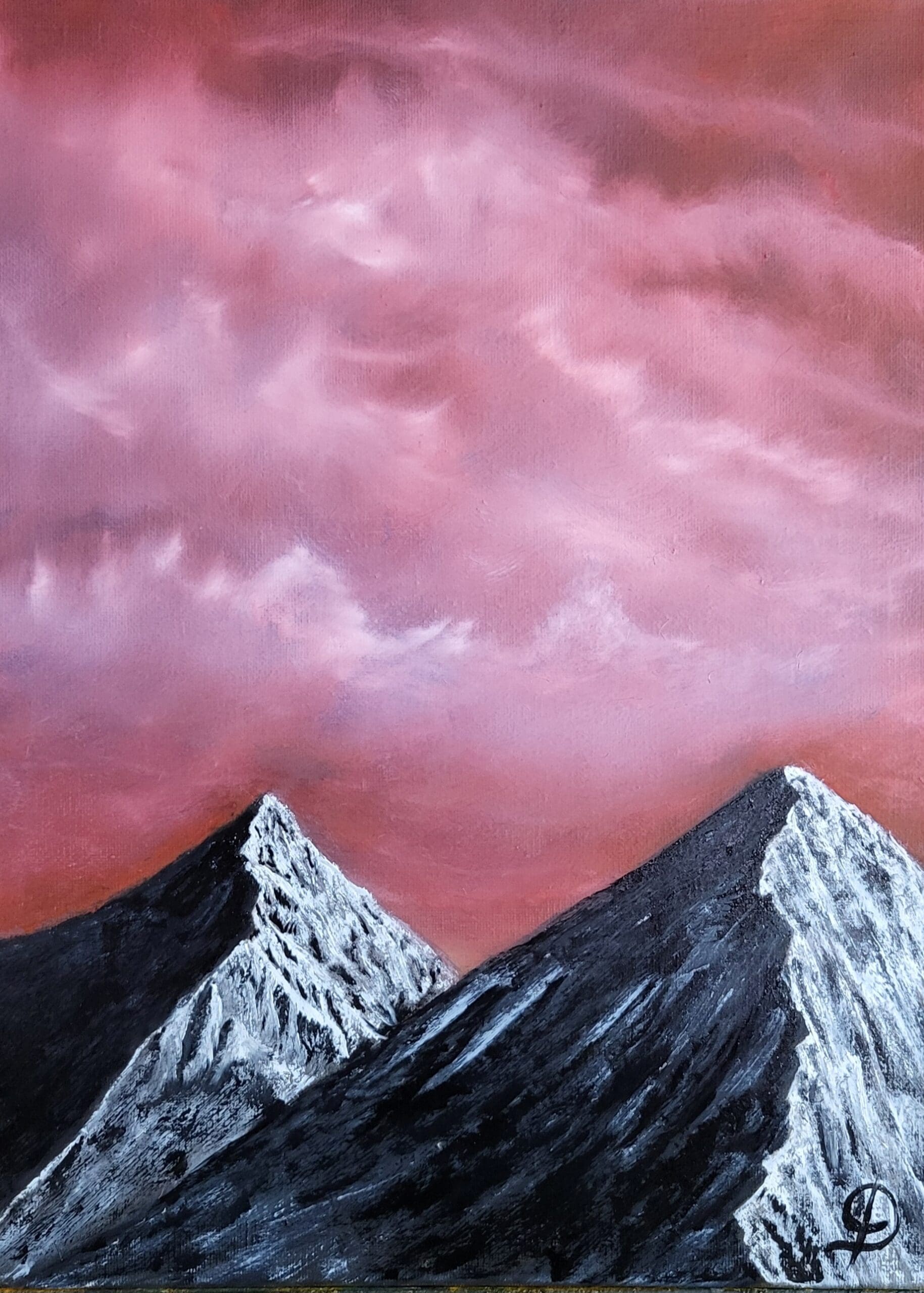 Oil on stretched canvas, 42 x 30 (A3), #408. Another mountain scene but with a difference. The sky in this piece is what should draw the eye, especially with the dark mountains prominent in the foreground.