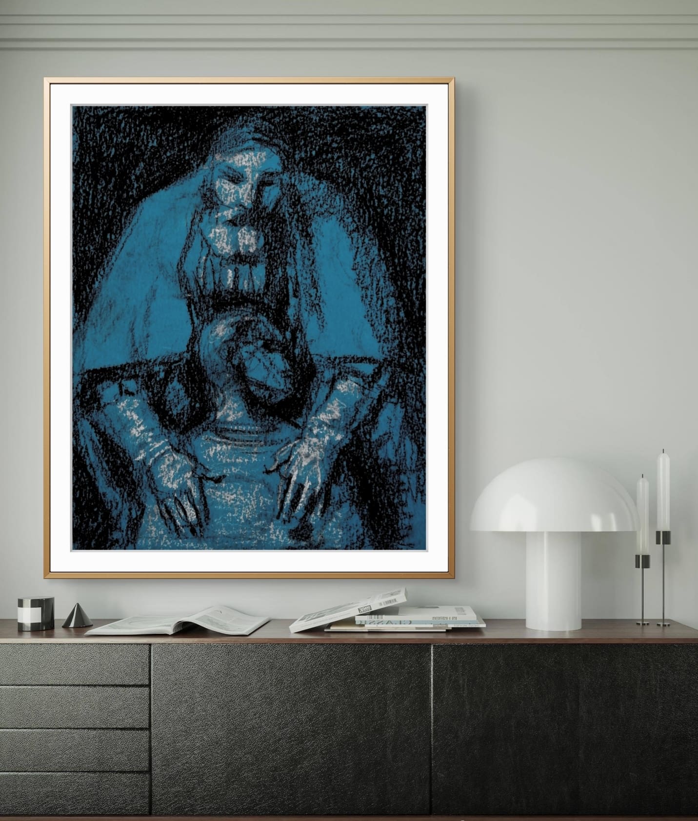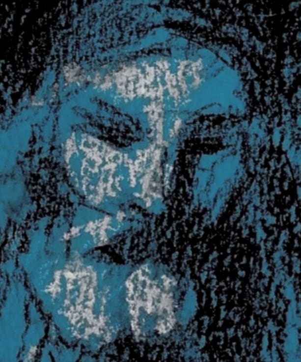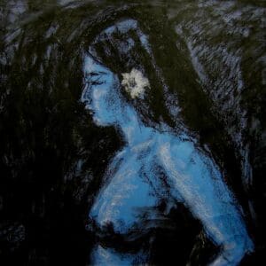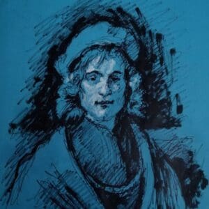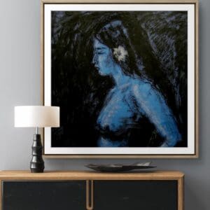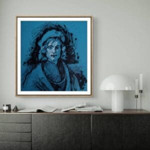 “Rembrandt Revisited: Quiet Consolation in Indigo” is a tender exploration of connection and care, focusing closely on two figures caught in a moment of quiet intimacy. The older figure, with a calm and gentle expression, leans forward to offer support, his hands resting thoughtfully on the younger seated figure’s shoulders. Their gesture speaks of comfort and reassurance, a shared pause amidst life’s challenges. The use of deep blue tones against dark shading sets a contemplative mood, highlighting the emotional depth without overwhelming the scene. Soft, expressive lines and textured pastel strokes bring a natural warmth to the piece, allowing the figures to breathe and relate in a way that feels both personal and timeless. This limited edition giclée print, numbered 7 of 10, offers a reflective reinterpretation of Rembrandt’s “The Prodigal Son,” inviting viewers to find solace in the enduring power of human compassion.