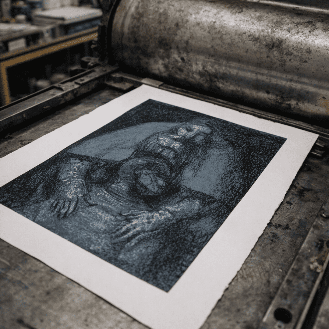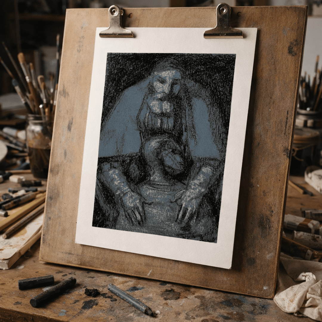 “Rembrandt Revisited: Quiet Consolation in Indigo” is a tender exploration of connection and care, focusing closely on two figures caught in a moment of quiet intimacy. The older figure, with a calm and gentle expression, leans forward to offer support, his hands resting thoughtfully on the younger seated figure’s shoulders. Their gesture speaks of comfort and reassurance, a shared pause amidst life’s challenges. The use of deep blue tones against dark shading sets a contemplative mood, highlighting the emotional depth without overwhelming the scene. Soft, expressive lines and textured pastel strokes bring a natural warmth to the piece, allowing the figures to breathe and relate in a way that feels both personal and timeless. This limited edition giclée print, numbered 1 of 5, offers a reflective reinterpretation of Rembrandt’s “The Prodigal Son,” inviting viewers to find solace in the enduring power of human compassion.