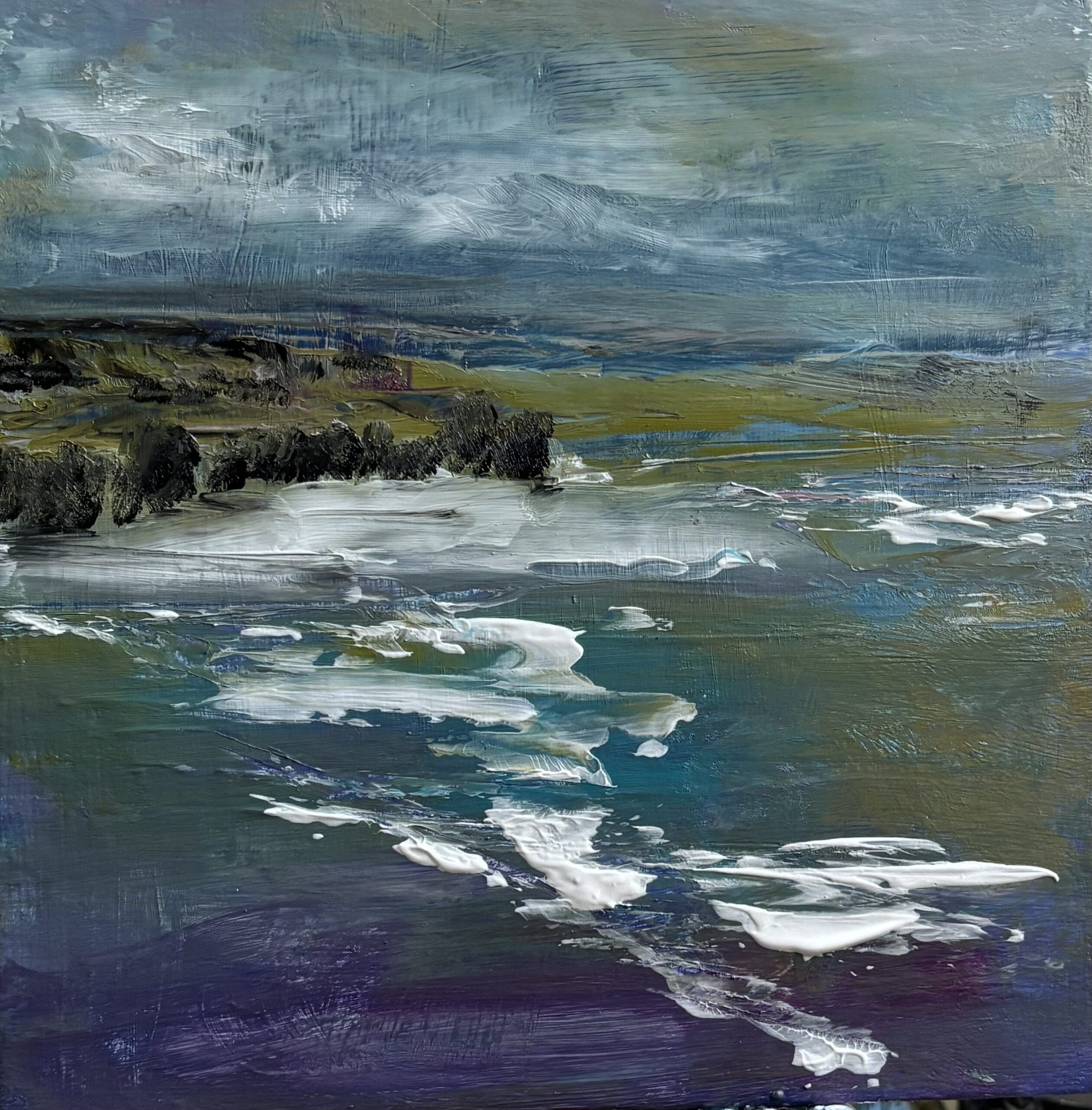 A hint at the coastal scenes here in the beautiful west of Ireland. Rugged rocks, sea green waters, white crashing waves under a heavy moody sky. Small artwork 20cm x 20cm unframed.