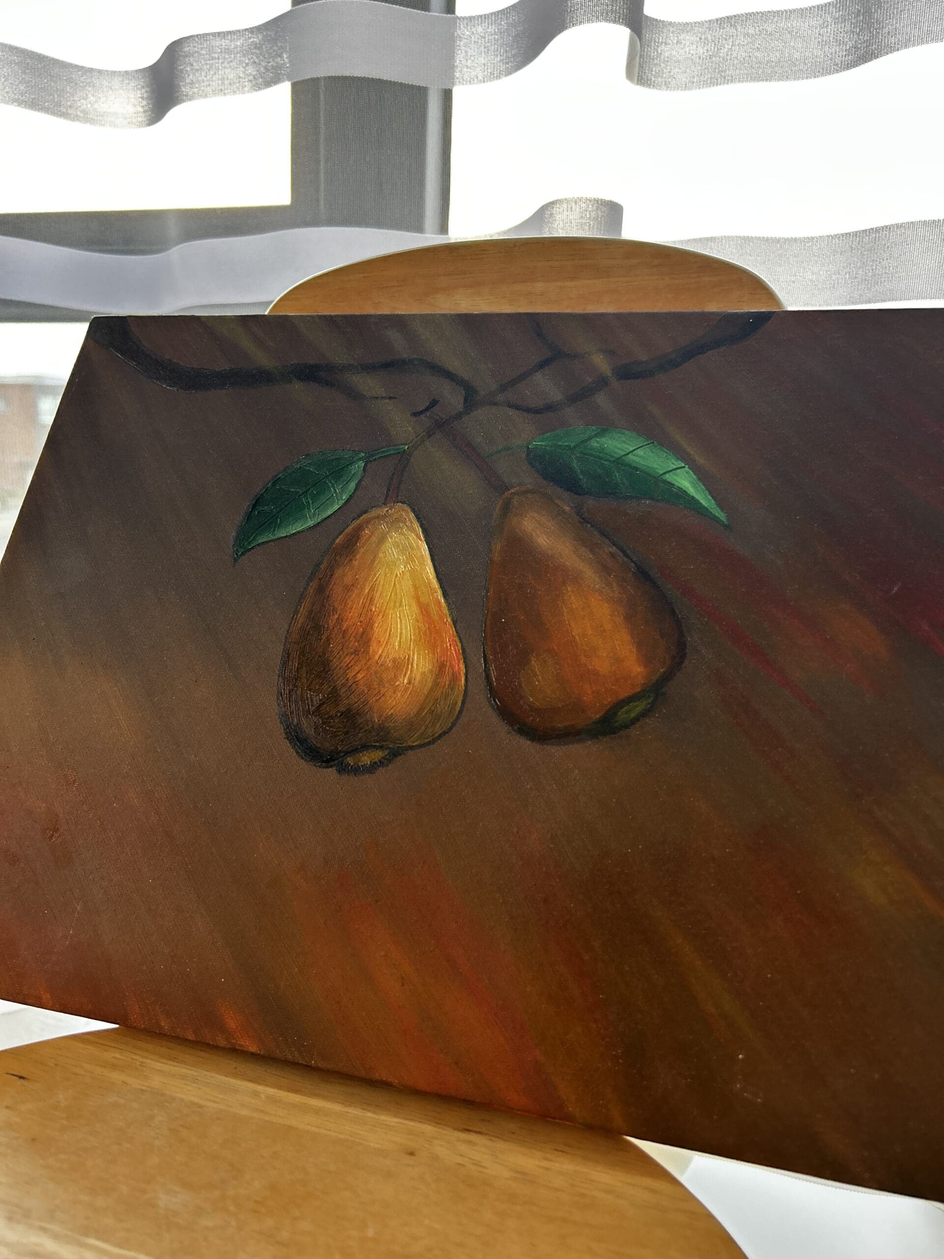 Ripeness is an original oil painting on canvas depicting two ripe pears suspended from a branch against a warm, textured background. The composition balances simplicity with depth, drawing attention to form, colour, and subtle movement.