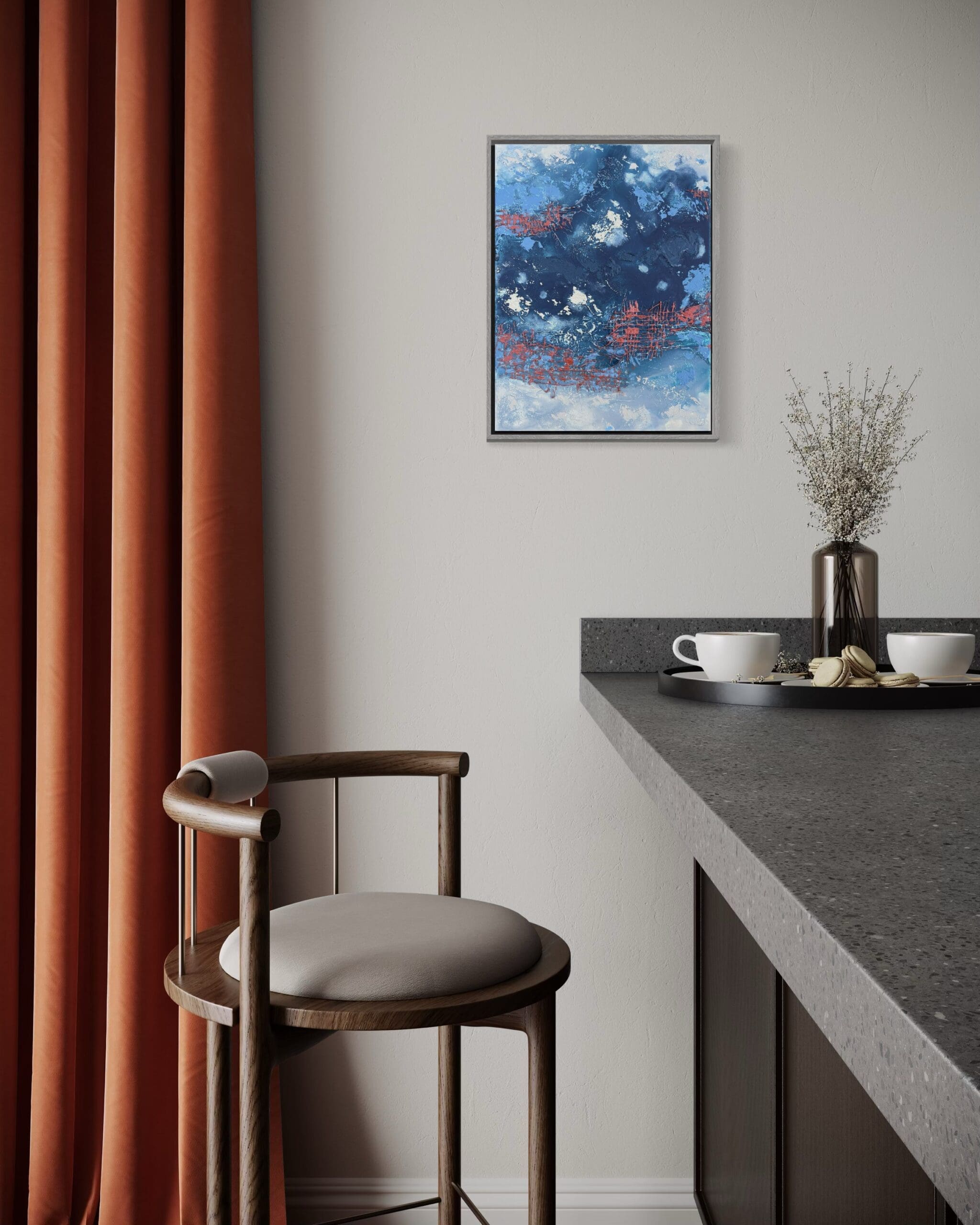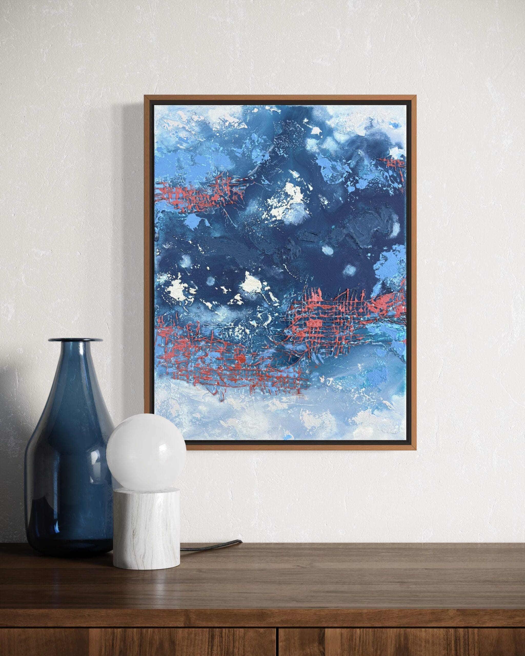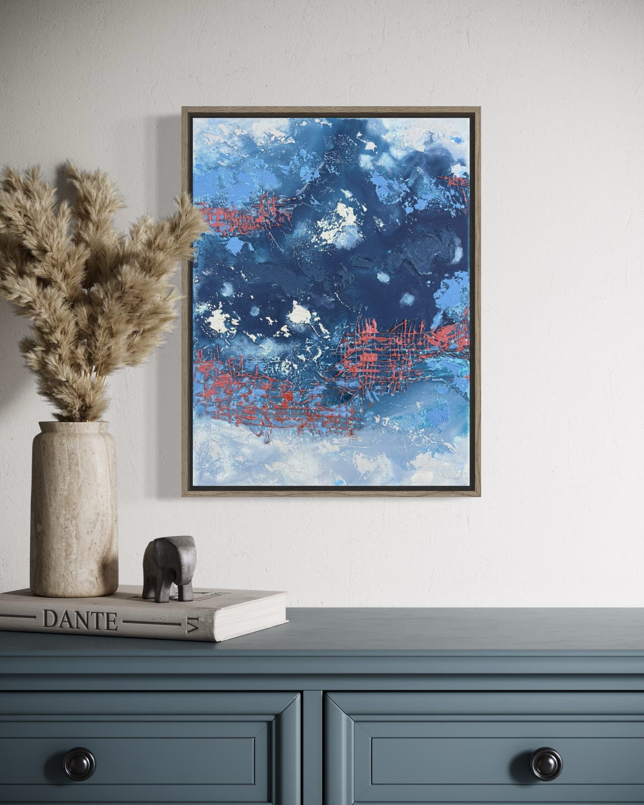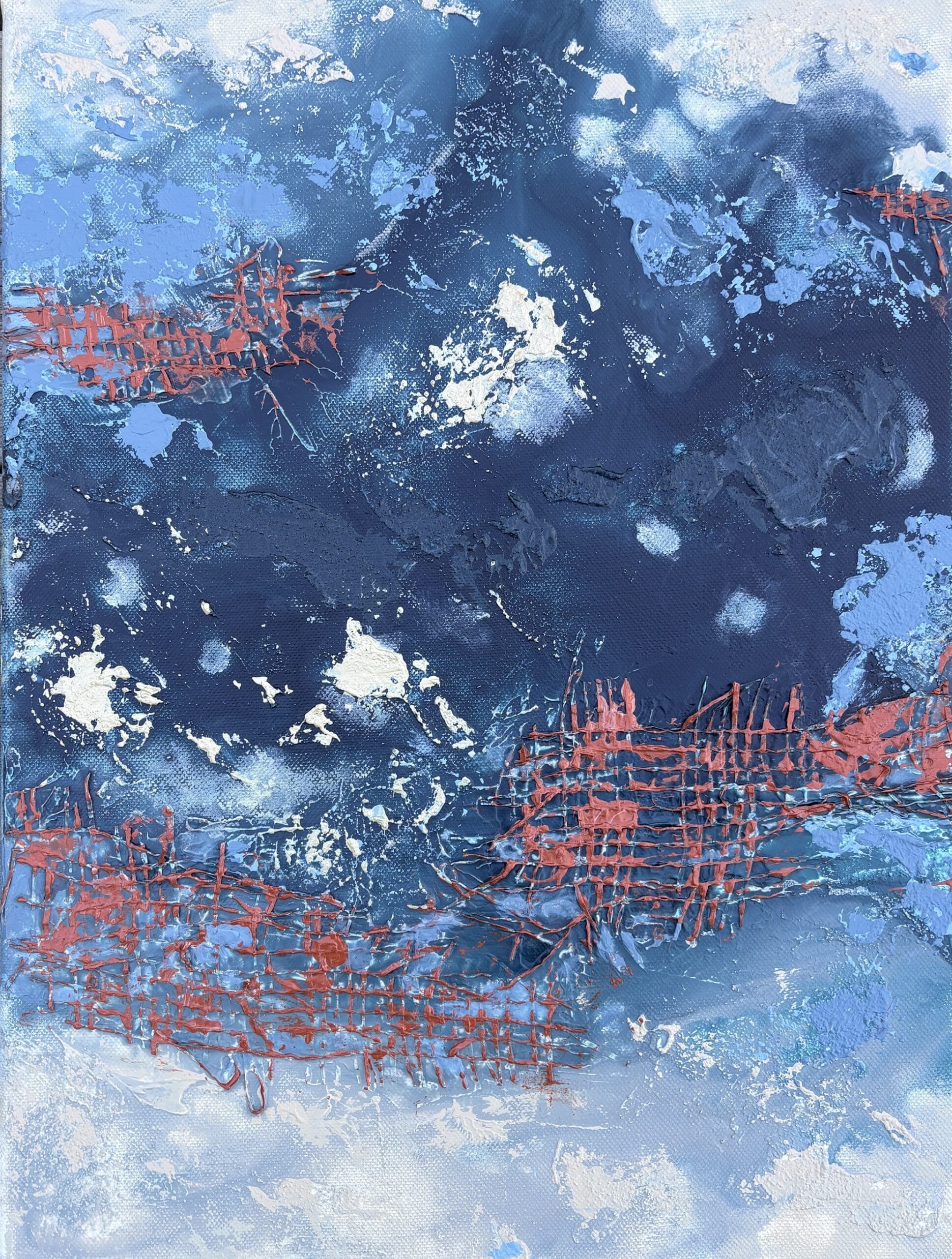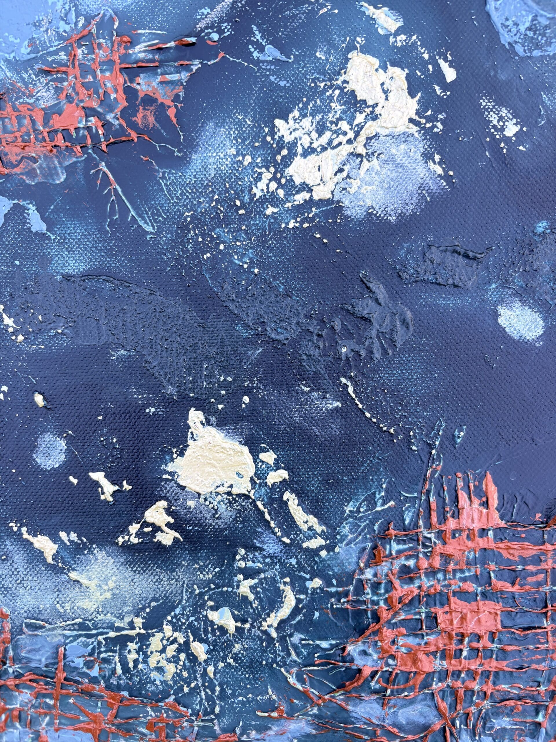Acrylic, sand and reclaimed netting on canvas. This artwork is on high quality stretched canvas and finished with a light satin varnish to protect from dust and sunlight. It comes in a floating frame made from natural fir wood. If you want to purchase the painting unframed, please make an offer or get in touch via the contact form.