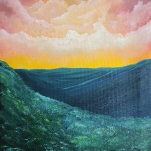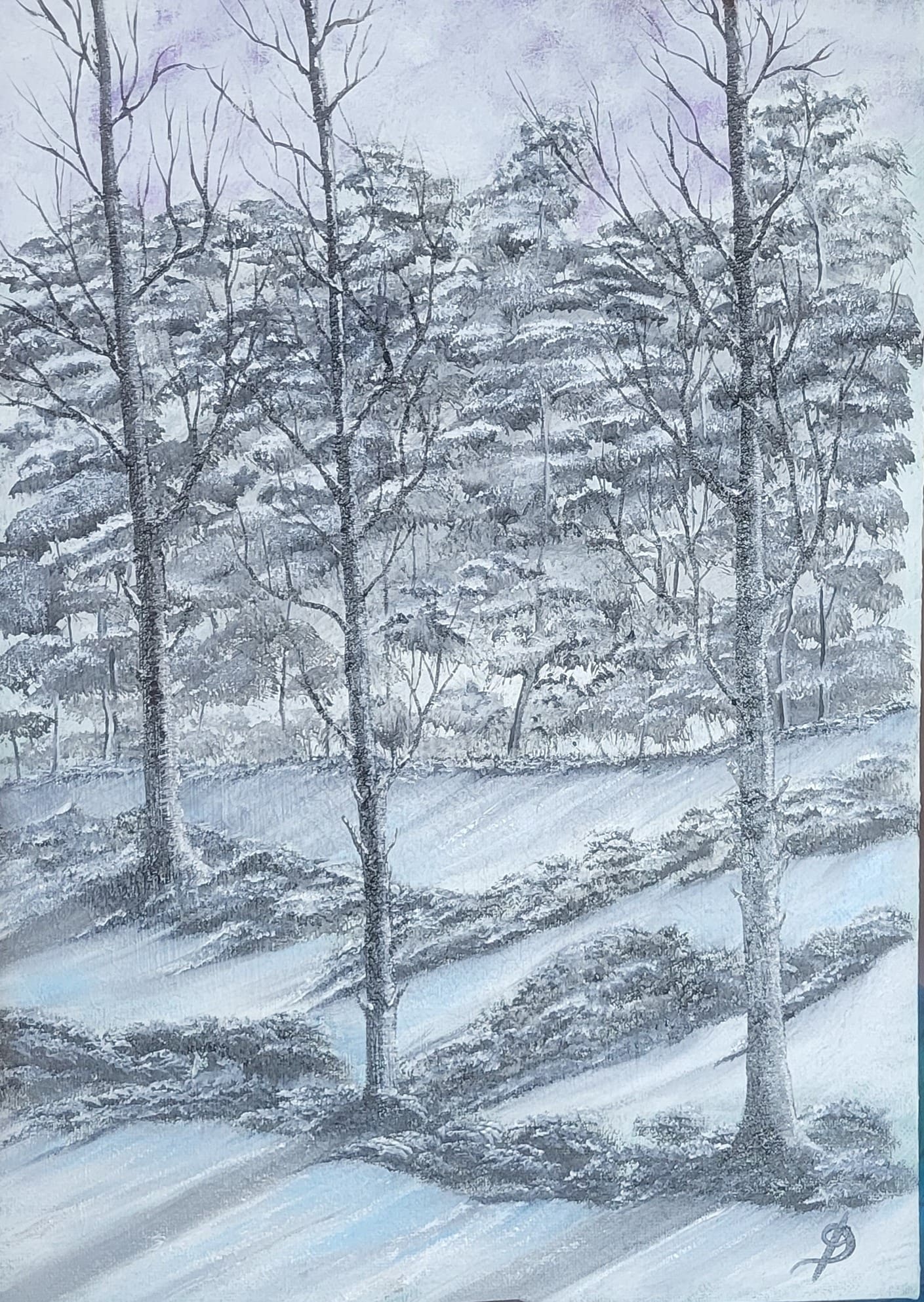 Original oil painting #300 on stretched canvas measuring 42 x 30 cms. Another tough painting to start as it was originally a very green oil painting which I was never fully sure if I liked it or not. It had to go and as I was in my cold phase, the black and white paint was added with the hint of blue to add a little coldness to the painting.