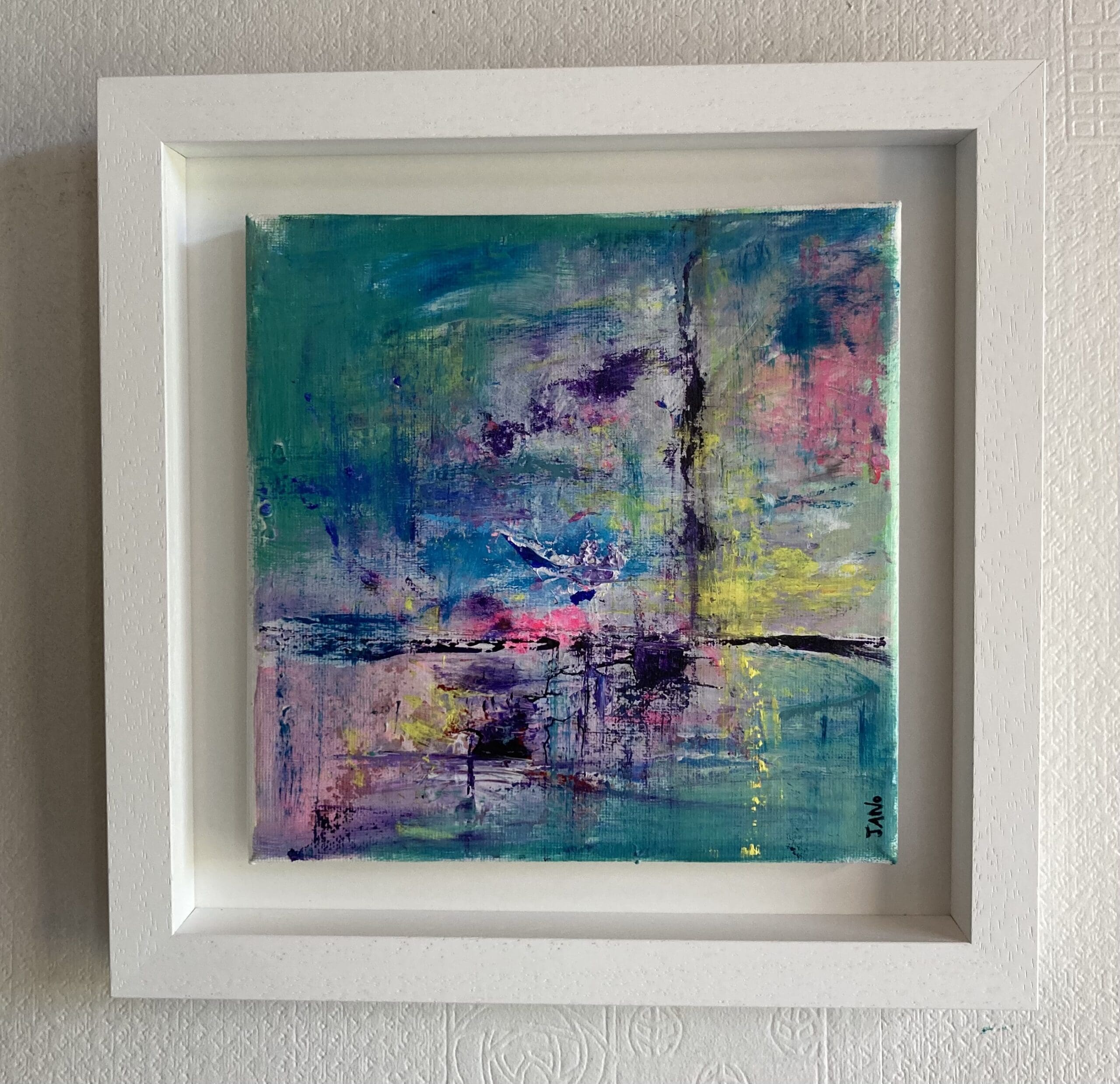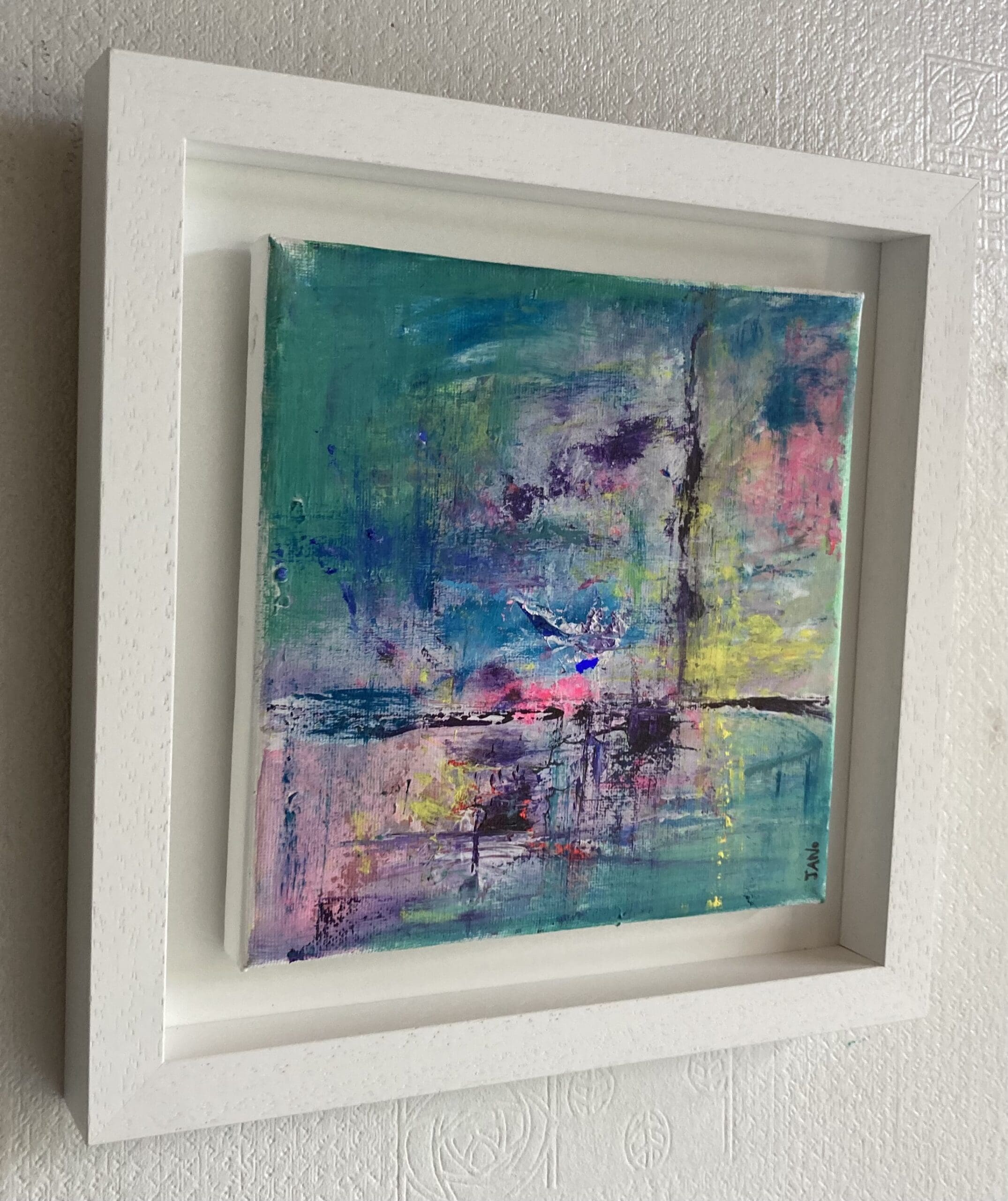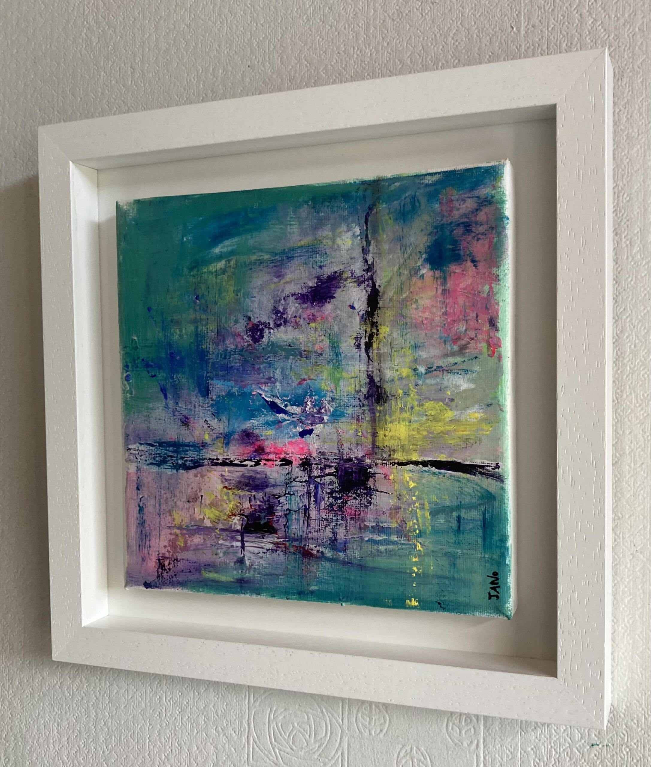 Delightful artwork for your contemporary space, framed in a white wooden tray frame.