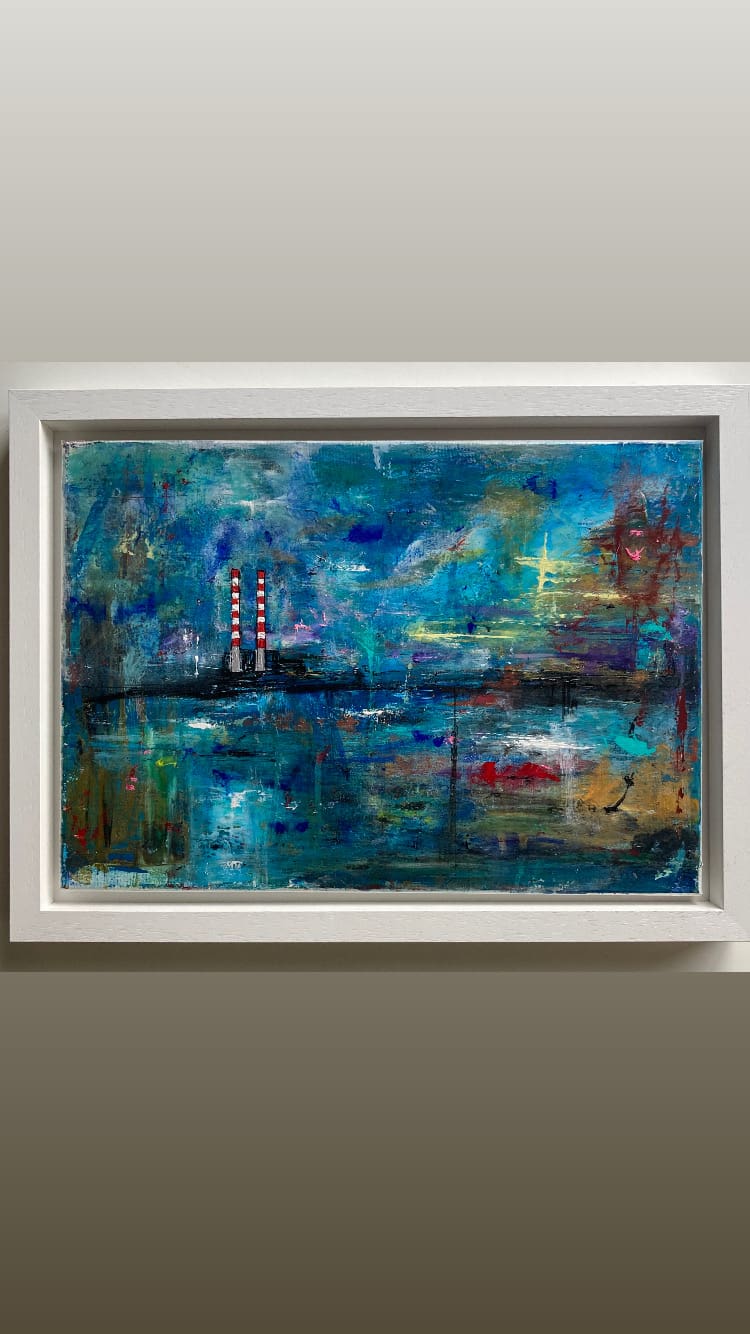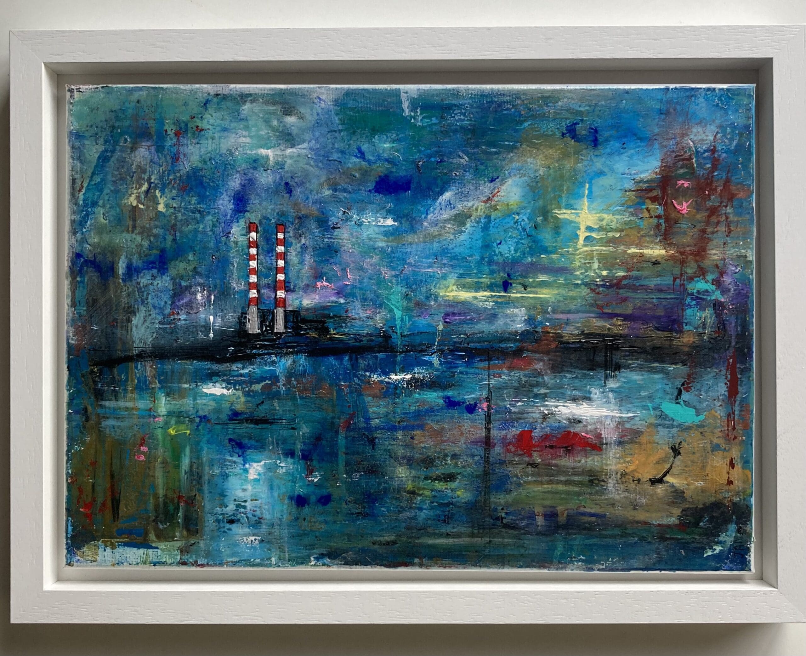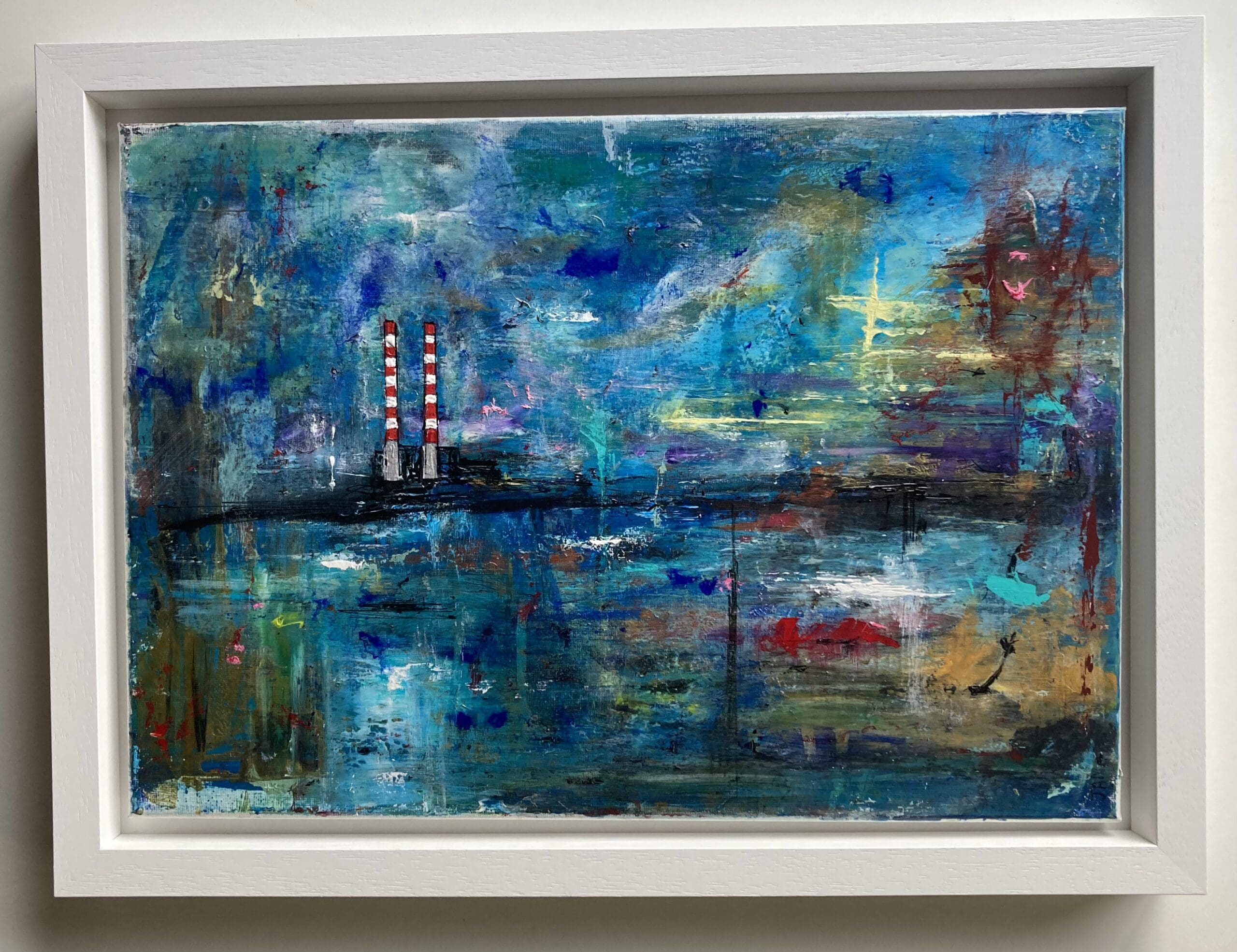 Original abstract painting in acrylic. Dublin seascape featuring the iconic Poolbeg chimneys.