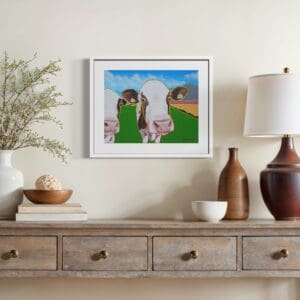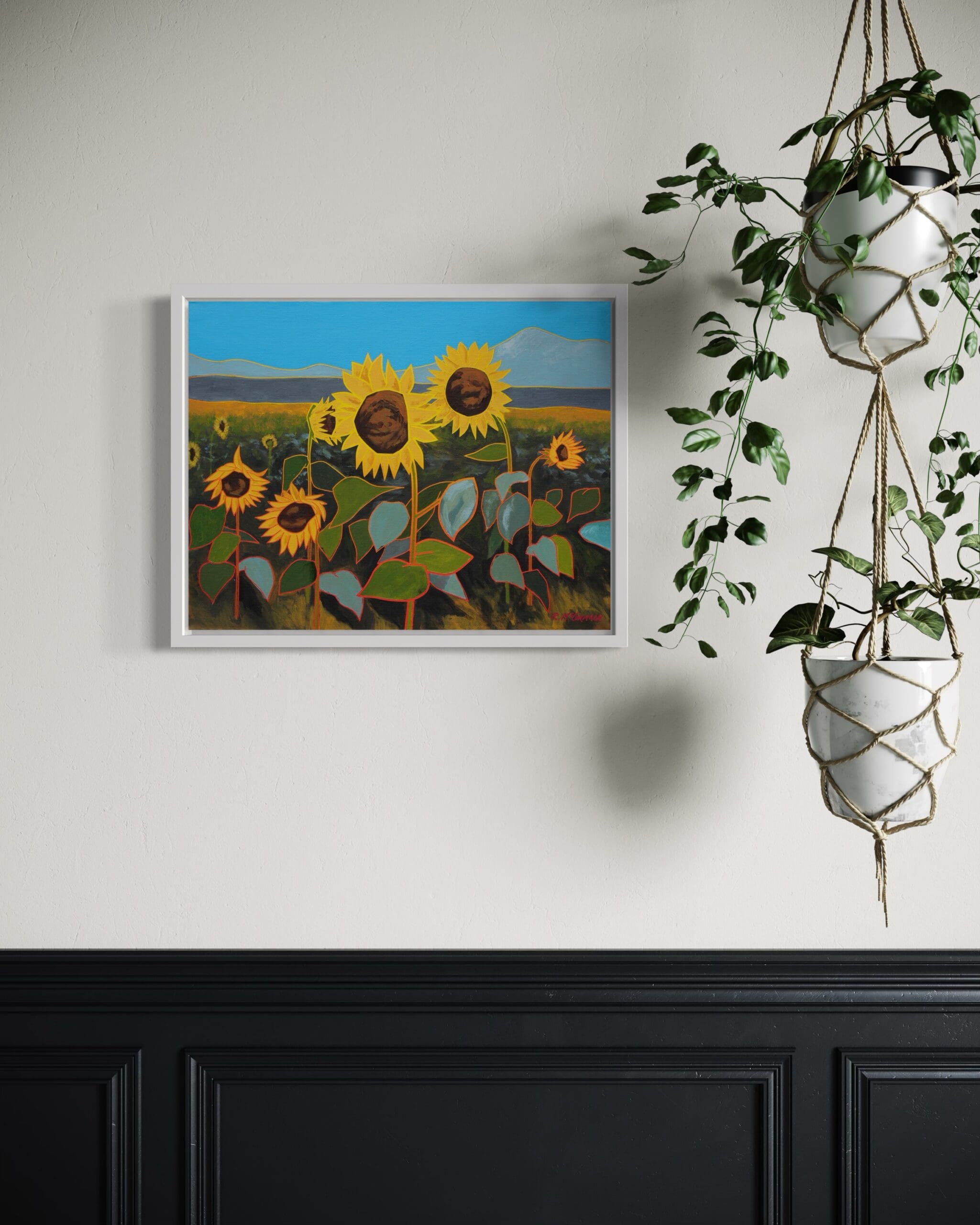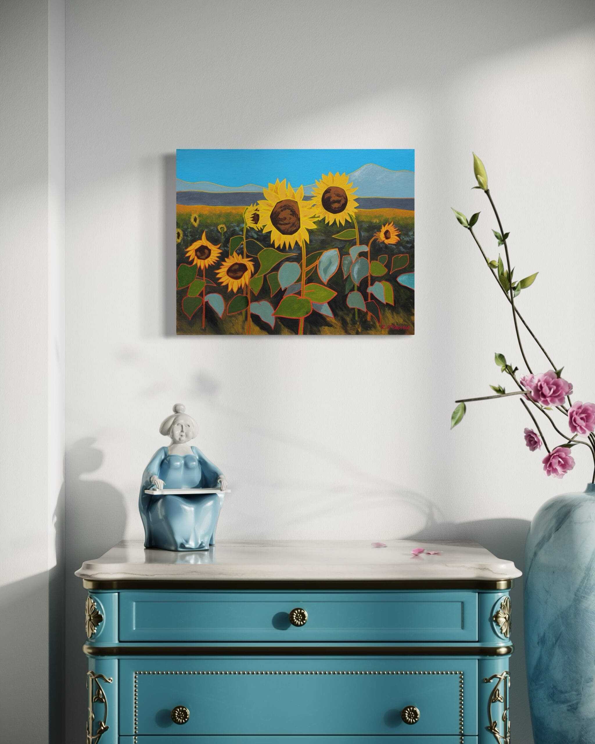 A radiant celebration of warmth and whimsy, in Rob’s hidden light style, this piece invites viewers into a joyful field where sunflowers beam with character. Each bloom gives an impression of a face face, turning this vibrant landscape into a tapestry of personalities basking under a brilliant blue sky. Nestled against distant mountains and framed by lush greenery, the painting captures a moment of pure light, making it a standout centerpiece that sparks smiles and conversation wherever it’s displayed.
