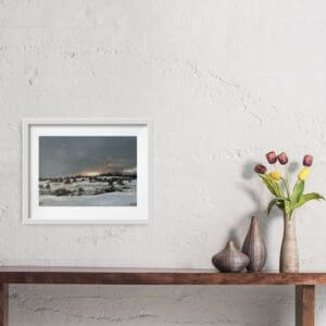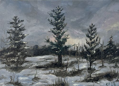 Original oil painting by Karina Fleming was inspired by an evening walk in Abbeyleix bog in those rare snowy days in Ireland. The bog looked magically peaceful and quiet.