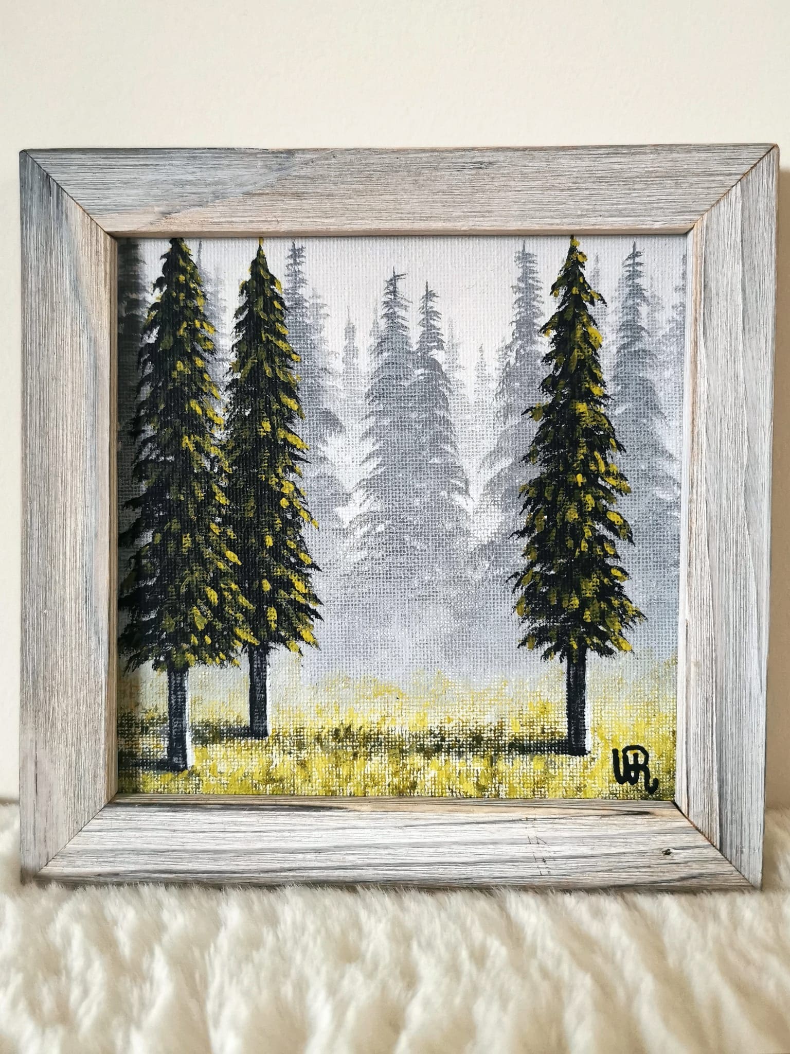 Another place I discovered in my mind, painted in a limited color palette. The painting will come framed and ready to hang. The frames are crafted by me and my husband using recycled wood, burnt and painted, cut to measure to create this rustic frames, each one being unique