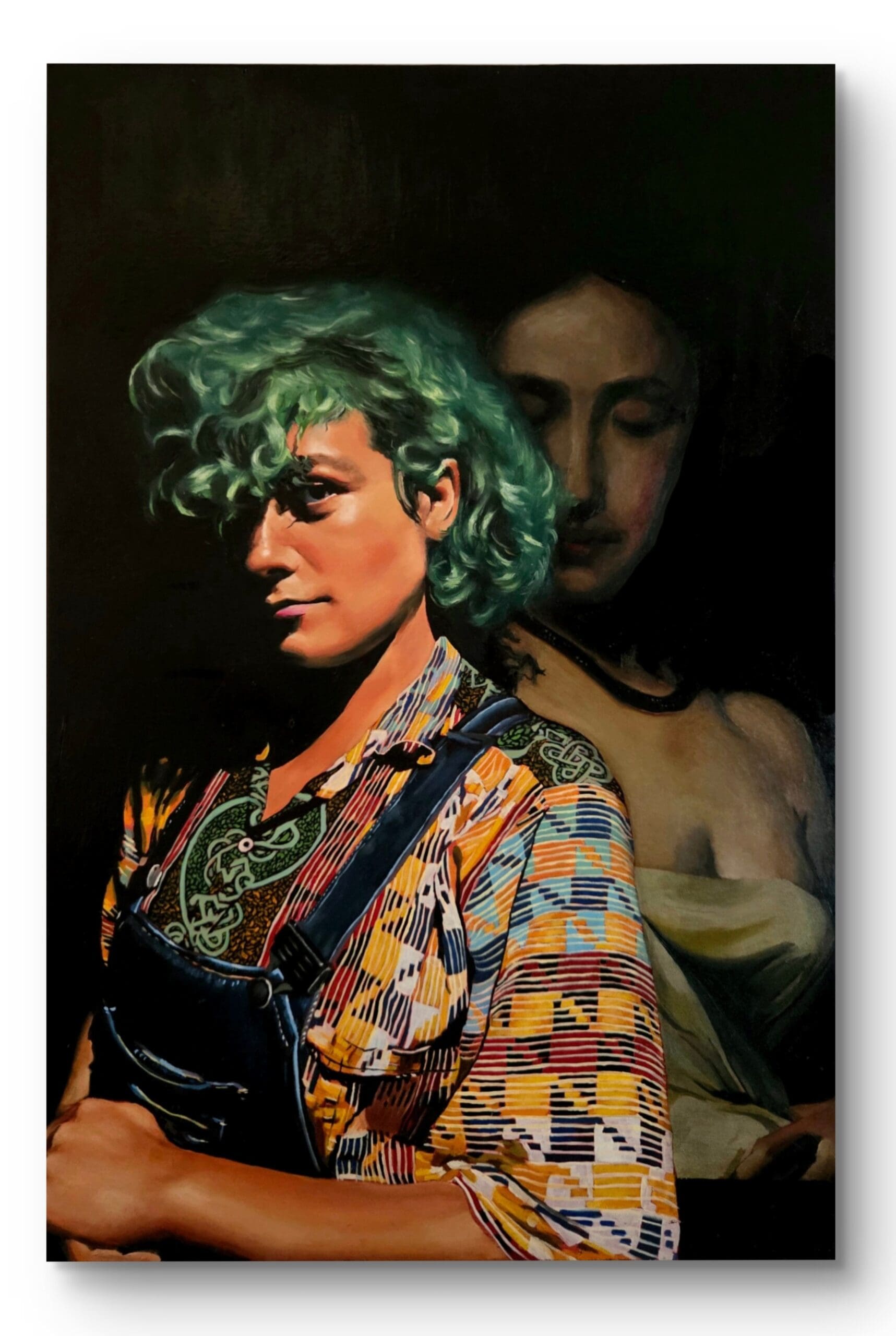 Original portrait oil painting of a personal friend, combining the older style of fine art painting with a modern colourful stule of the subject. Painted on a 50x75cm stretched canvas with a satin varnish finish