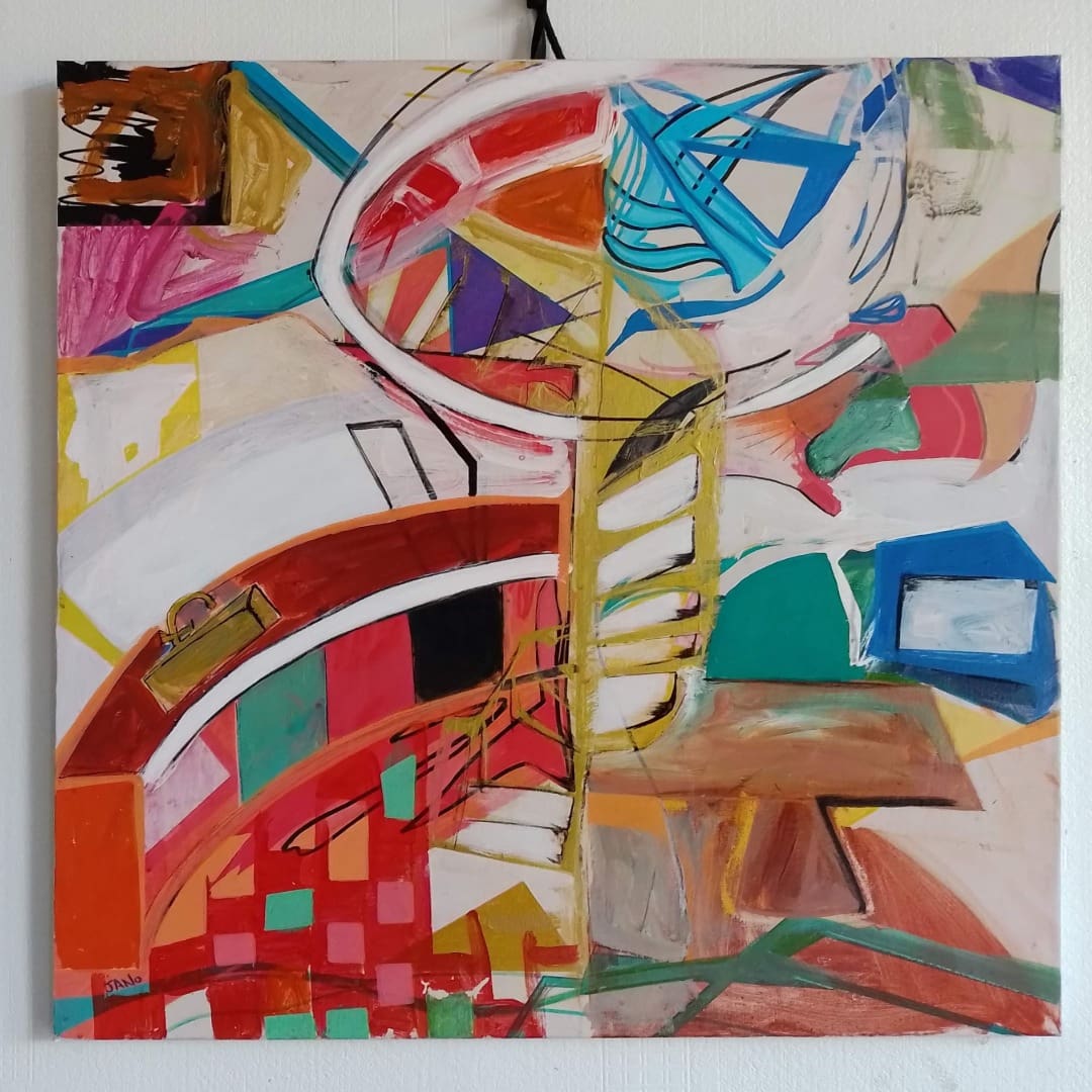 Who wouldn’t want a spiral staircase in their kitchen? Original painting inspired by a large masterpiece, Mirror by Frank Bowling. Framed in a white wooden tray frame.