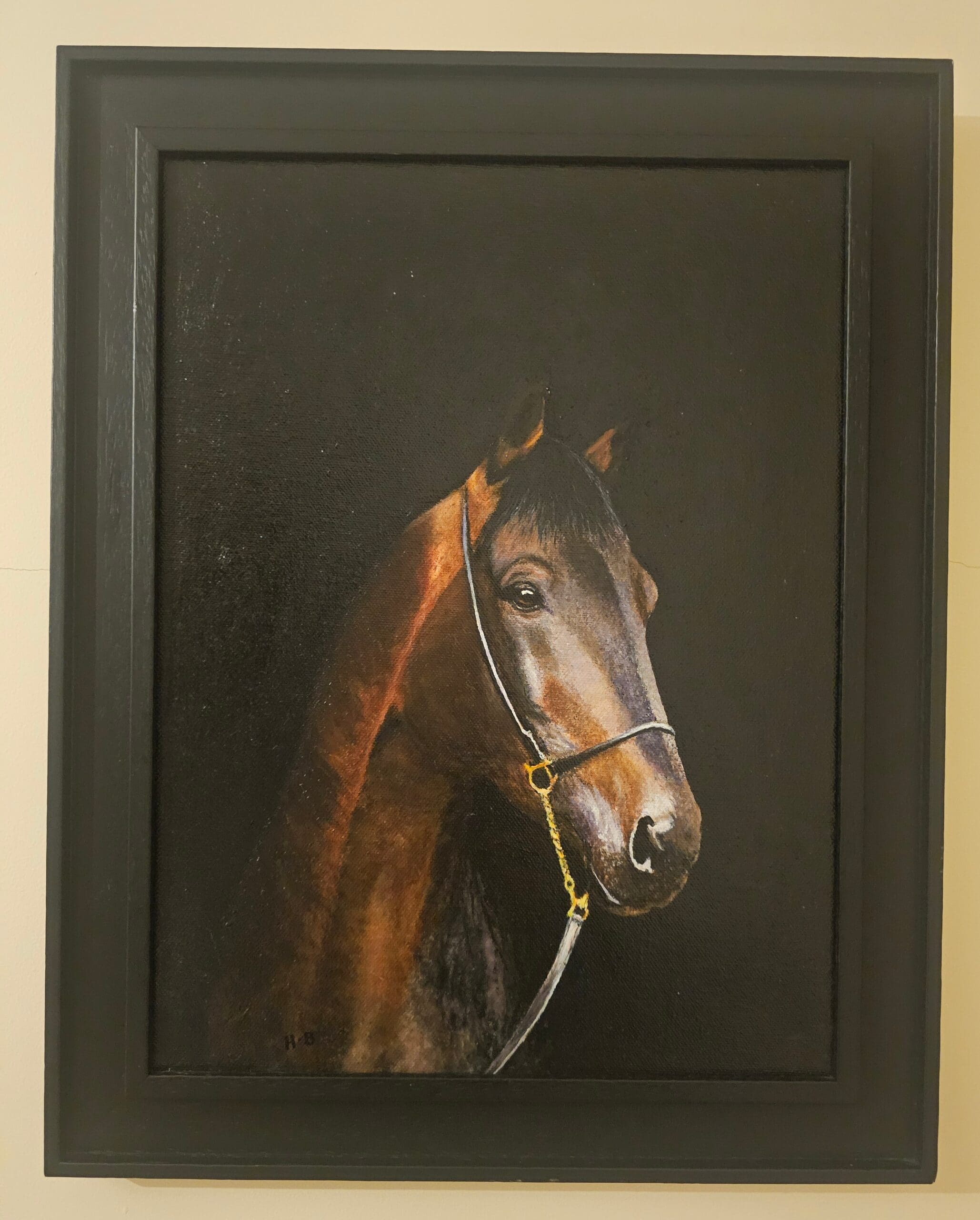 A finely rendered bridle, with a gold-toned ring and pale leather strap, adds a touch of elegance without overshadowing the animal’s natural beauty. Every detail — from the delicate whiskers to the gentle curve of the nostril — is painted with reverence for the horse’s nobility. Against the stark black backdrop, the portrait feels timeless, intimate, and dignified, capturing the essence of equine grace in a single, powerful moment.