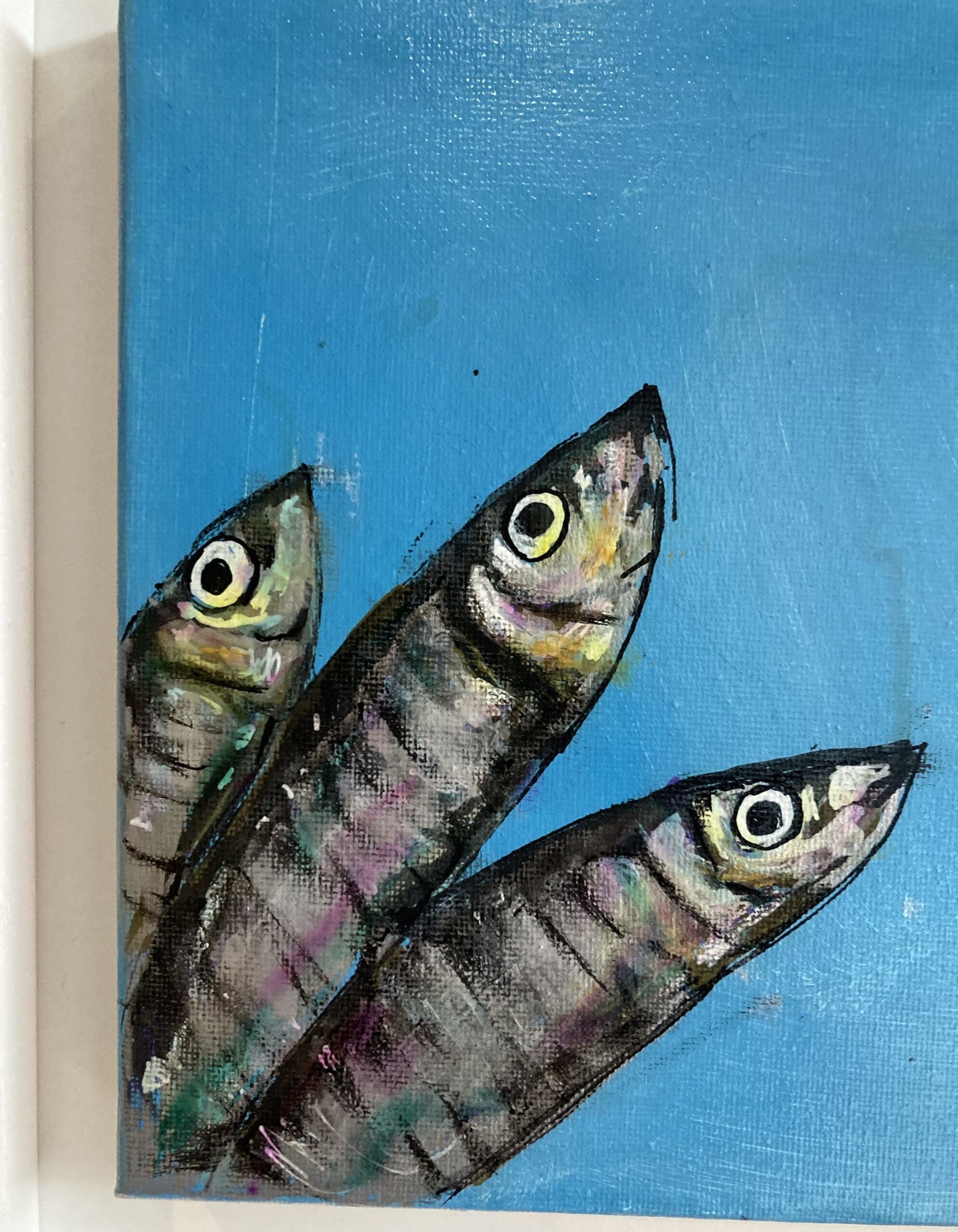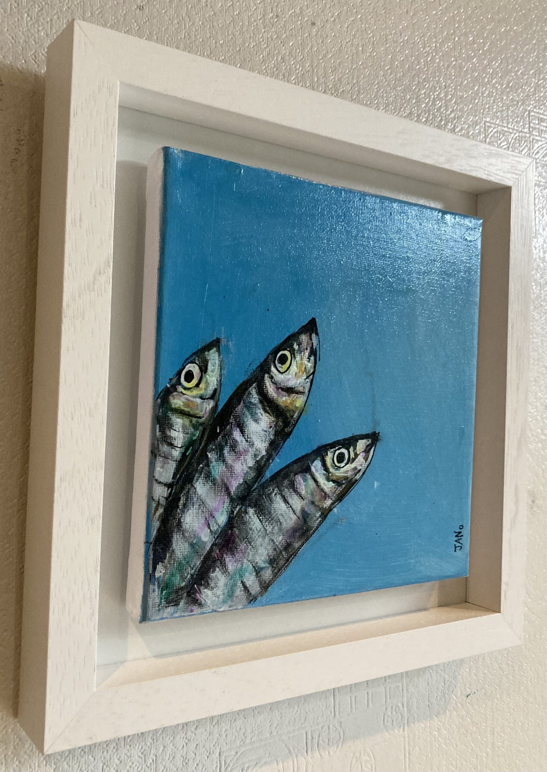 Original sardines in abstract . Framed in a white wooden tray frame – it appears a bit creamy coloured in photo but it is white.
