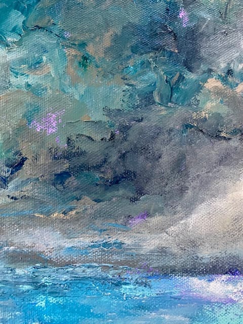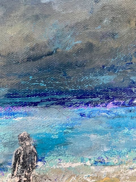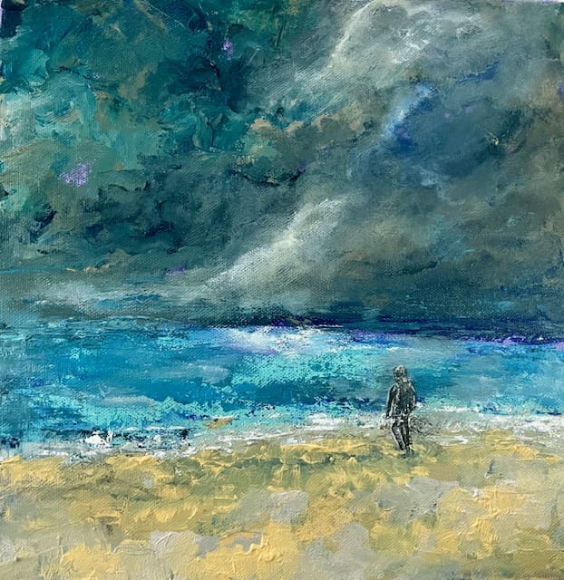 This piece is dominated by a swirlling Winter sky. I love strolls along the beach at this time of year.