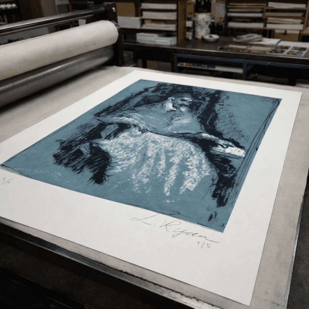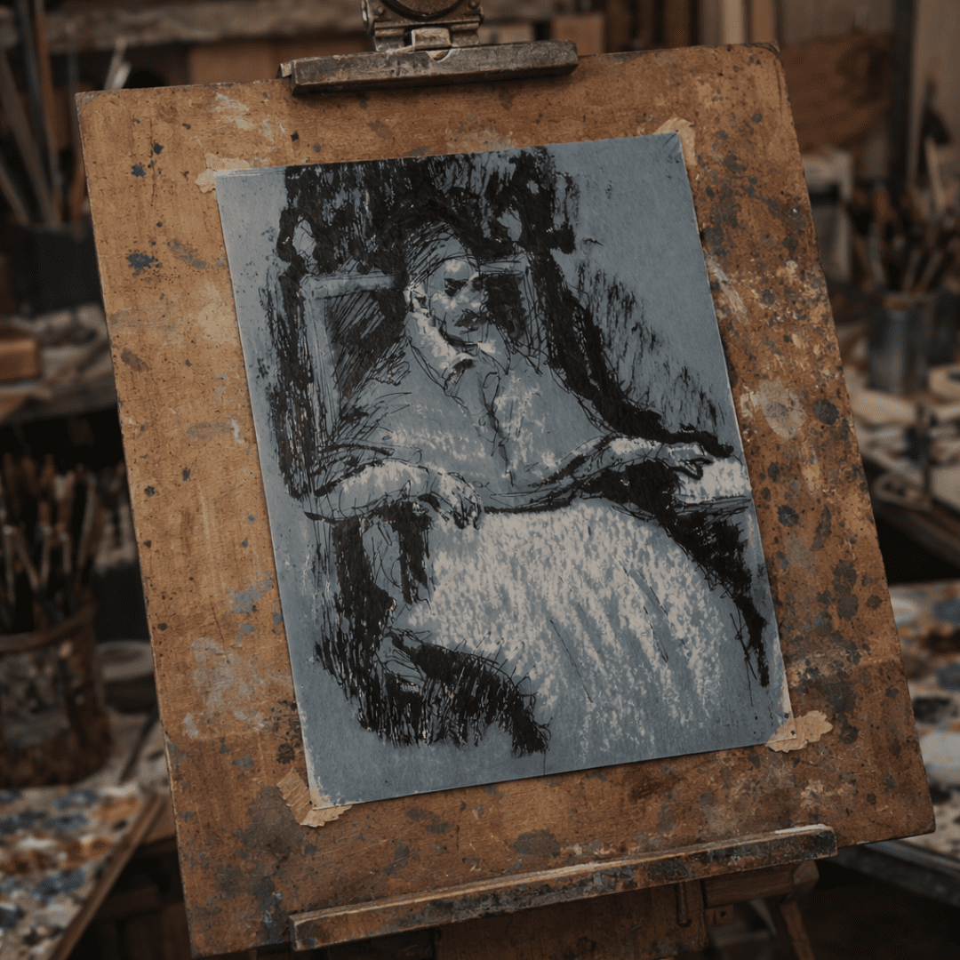 This piece offers a fresh take on a classic masterpiece, gently shifting the grandeur of Velázquez’s original into a more intimate, contemplative moment. Rendered in just black pen and white pastel on soft blue-gray paper, the composition embraces simplicity while inviting the viewer to linger on subtle details—the relaxed posture of the seated Pope Innocent X, the delicate collar of his garment, and the small book he holds with quiet intent. The monochrome palette strips away distractions, allowing mood and texture to take center stage through loose, expressive lines and soft shading. As a limited edition of five, each print is thoughtfully signed and numbered, making this work a quietly elegant addition for those who appreciate the harmony between tradition and personal interpretation.