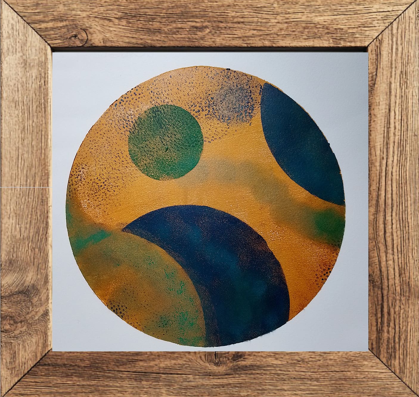 A round print in shades of blue, green and ochre. This print is akin to a reversed seascape, reflecting on the longing for a refuge from sensory overwhelm induced by urban life. The image is 8″ round print on white paper. The second image is for illustration only and the piece ships unframed.