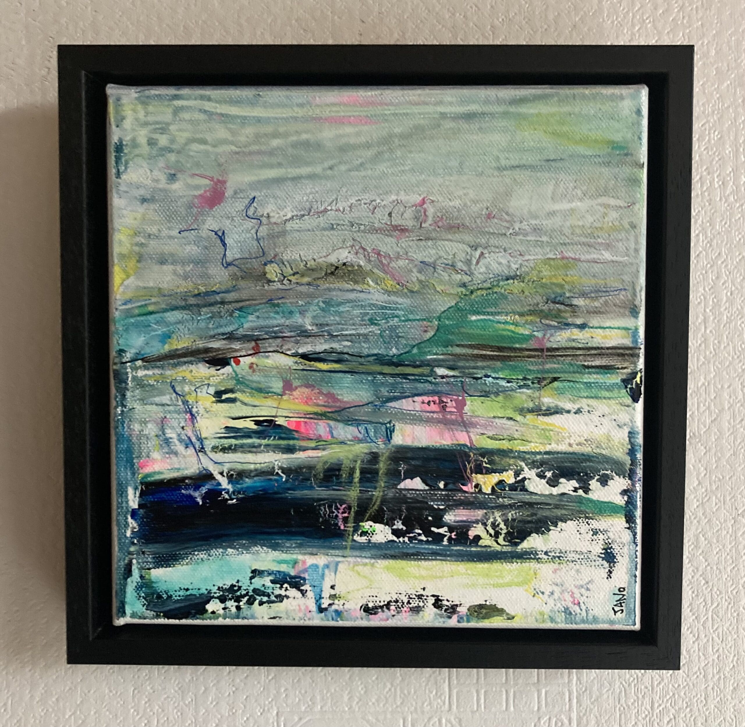 Original contemporary seascape in abstract, inspired by the wild Atlantic way. Framed in a black wooden frame.