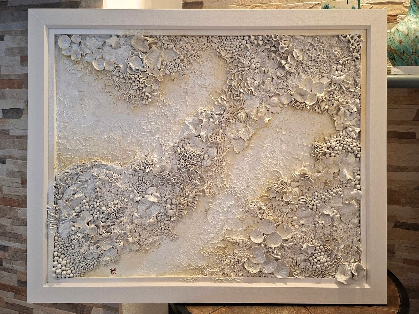 This one-of-a-kind mixed media wall artwork is inspired by coral reefs and the quiet, intricate beauty of the underwater world. When the Sea Goes Quiet is entirely handmade, with each individual form carefully shaped using modelling clay and layered to create a richly textured, sculptural surface.