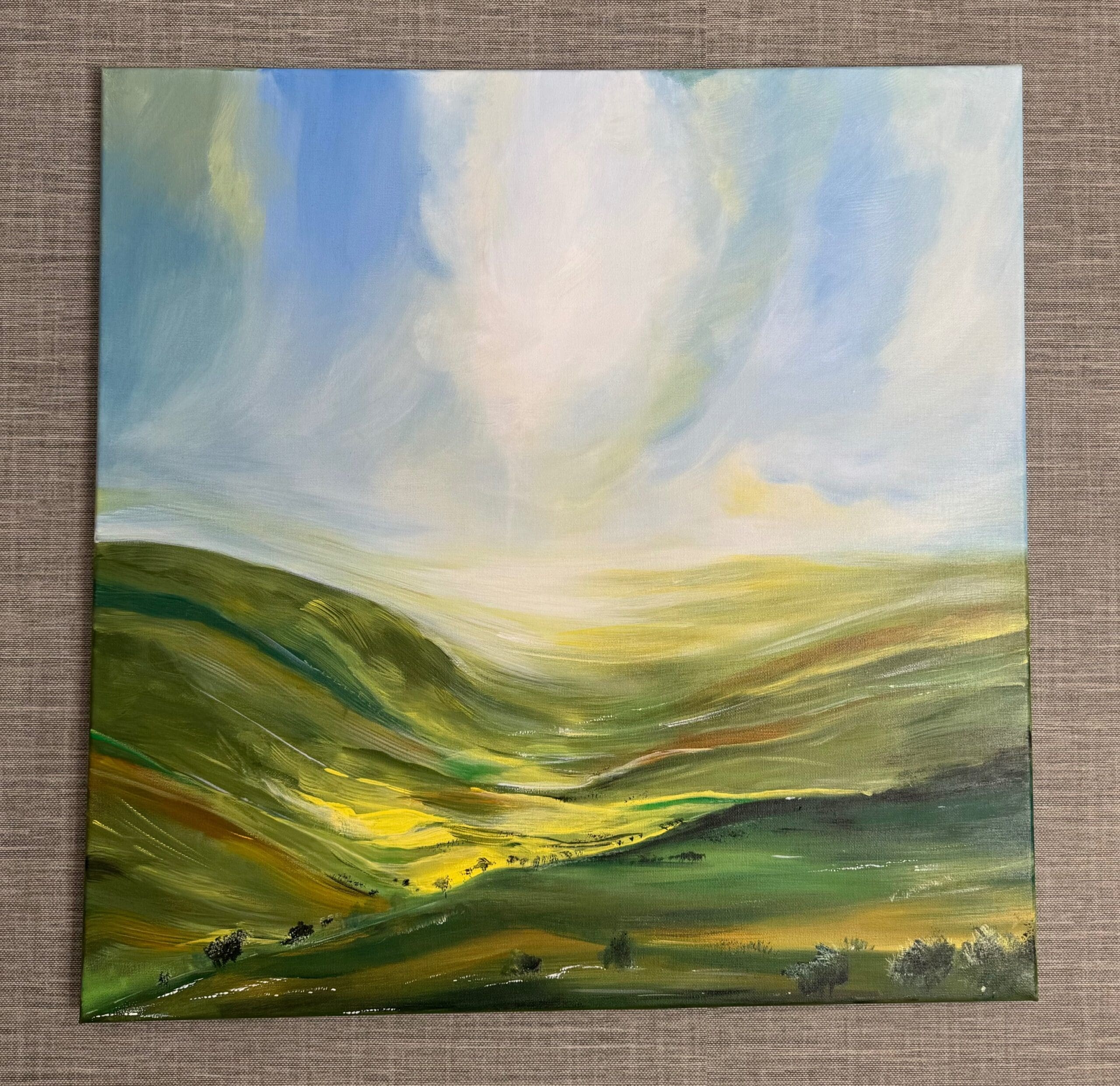 Rather than depicting a specific location, the painting invites the viewer into an emotional landscape — a place of calm, openness, and reflection. The smooth transitions of colour and the fluidity of the strokes create a sense of depth, movement, and stillness simultaneously.