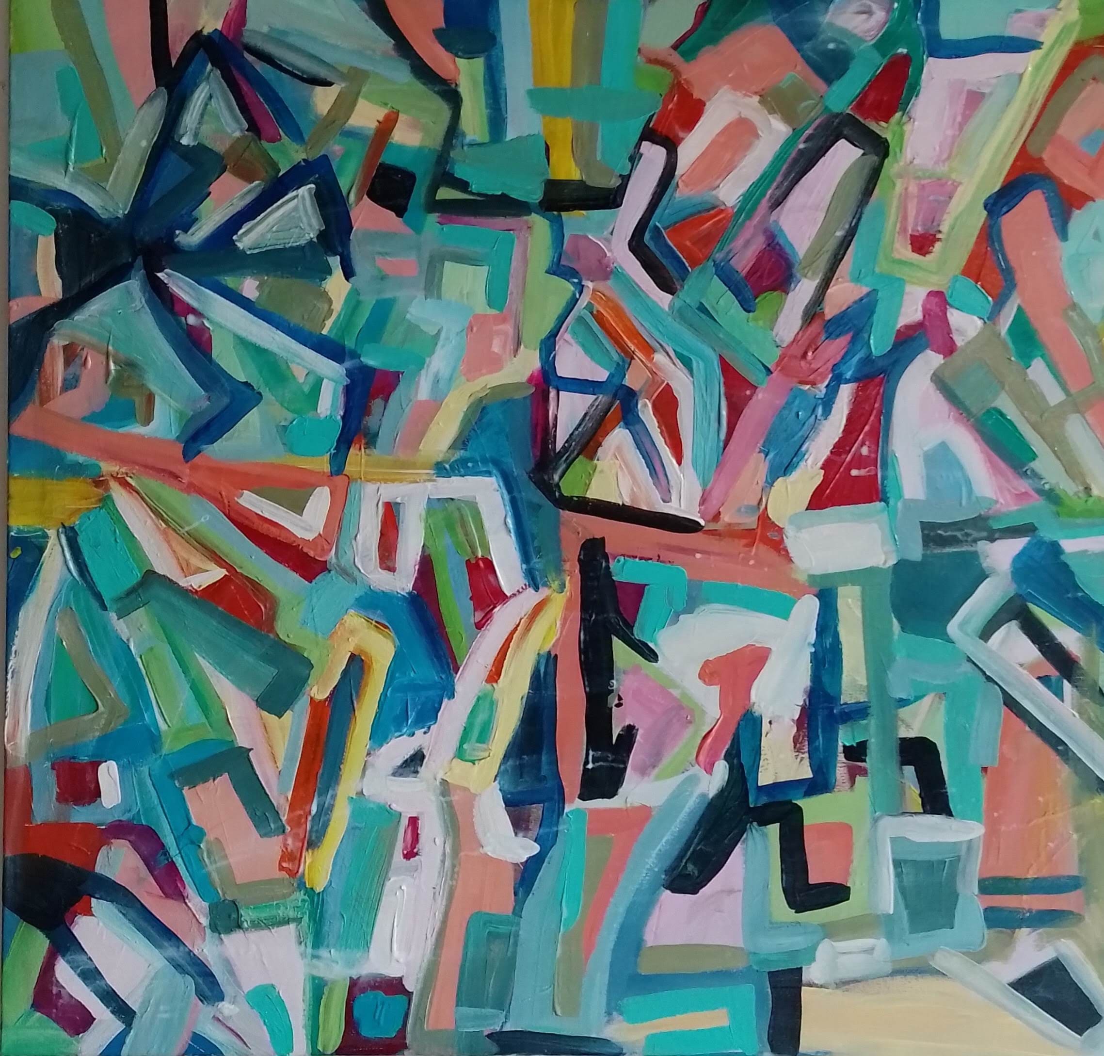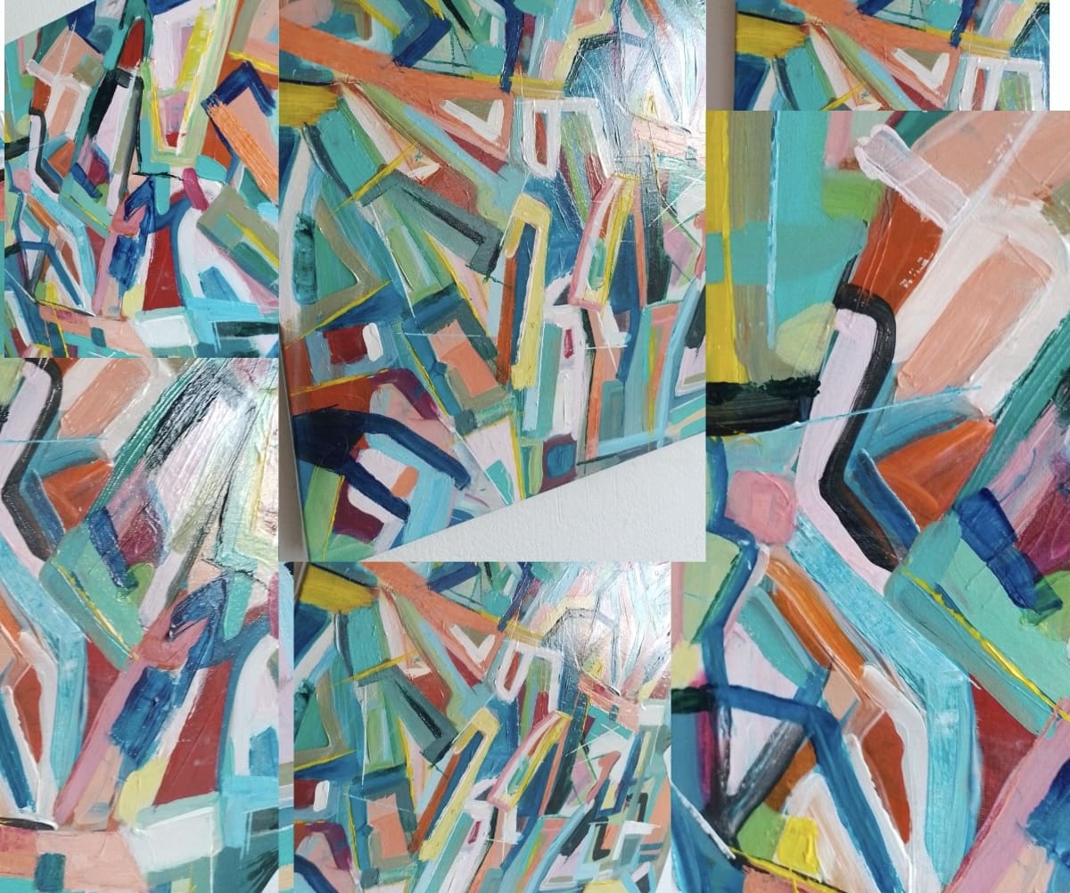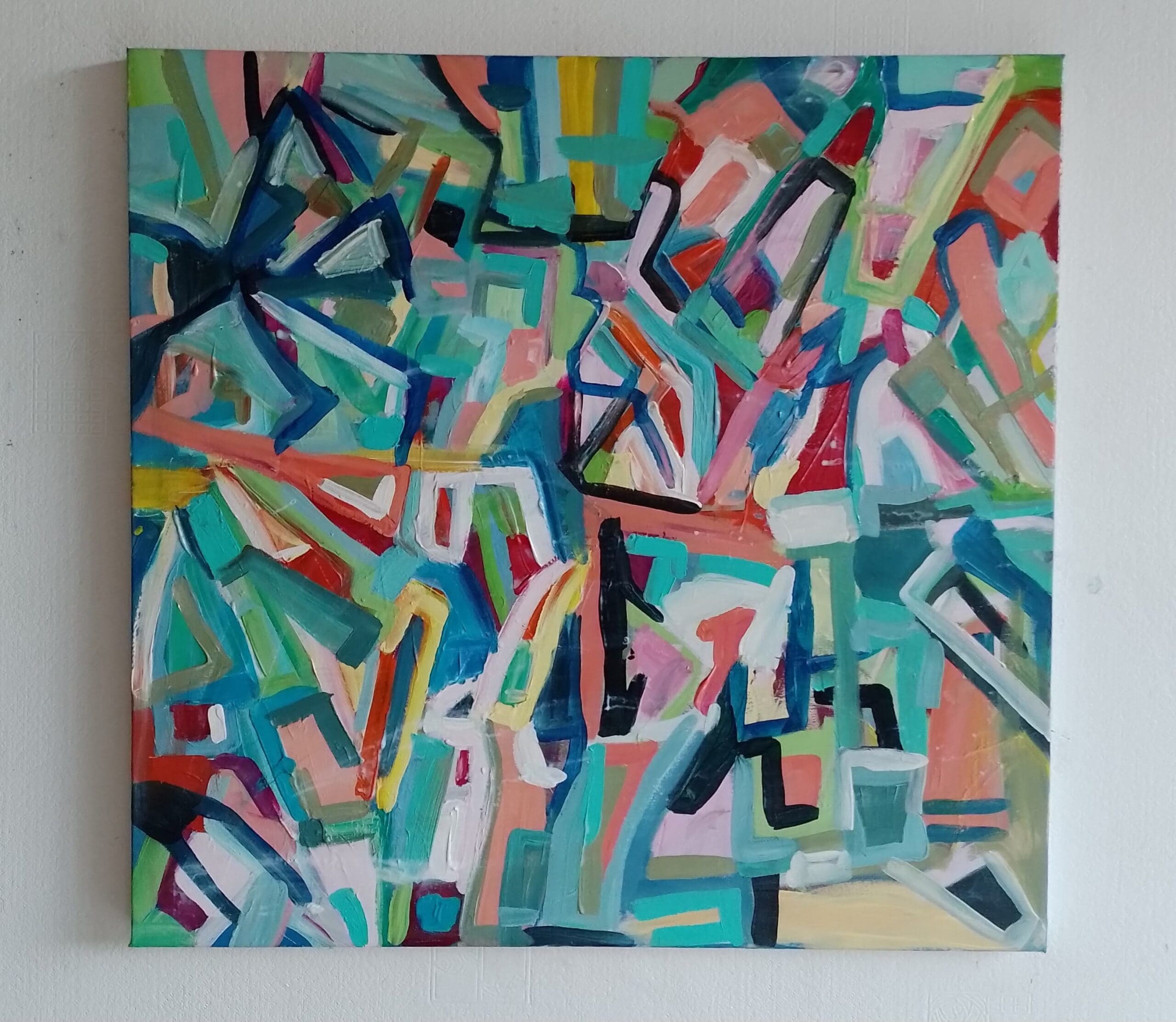 Original abstract painting using slices of colour in a slightly geometric pattern to create a stunning feature artwork for your space. Will work well in a minimalist space or stairway or hallway providing a focal point.
