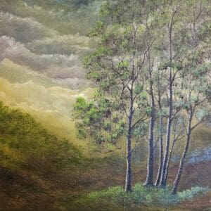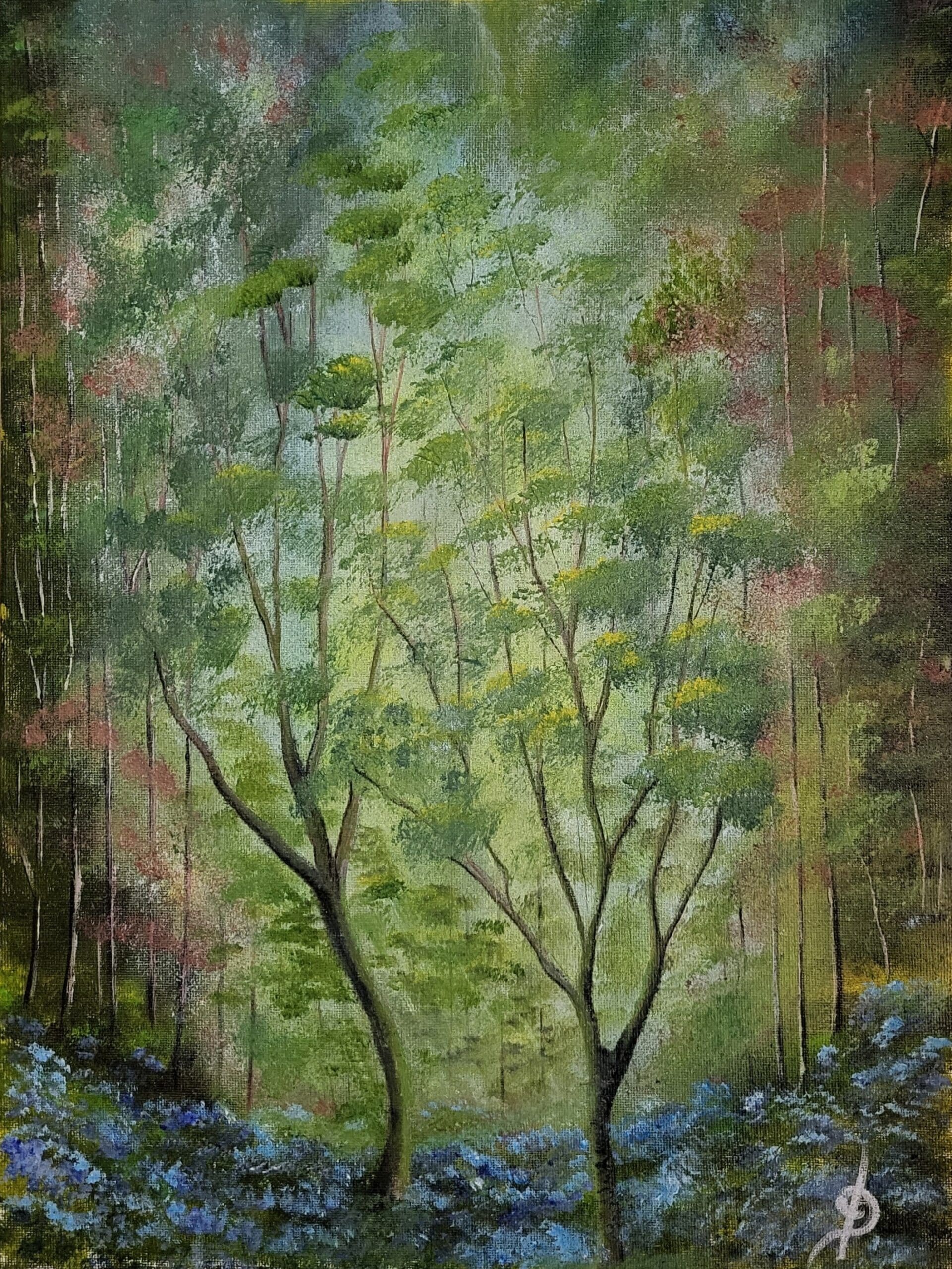 Original oil on panel #363 measuring 40 x 30 cms. Panel was prepared with a dark acrylic base to allow for the darker areas to highlight the centre. I added the various trees after creating a light effect in the centre. The addition of the blue in the foreground is intended to give the effect of bluebells in a woodland setting.
