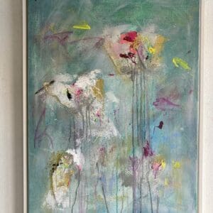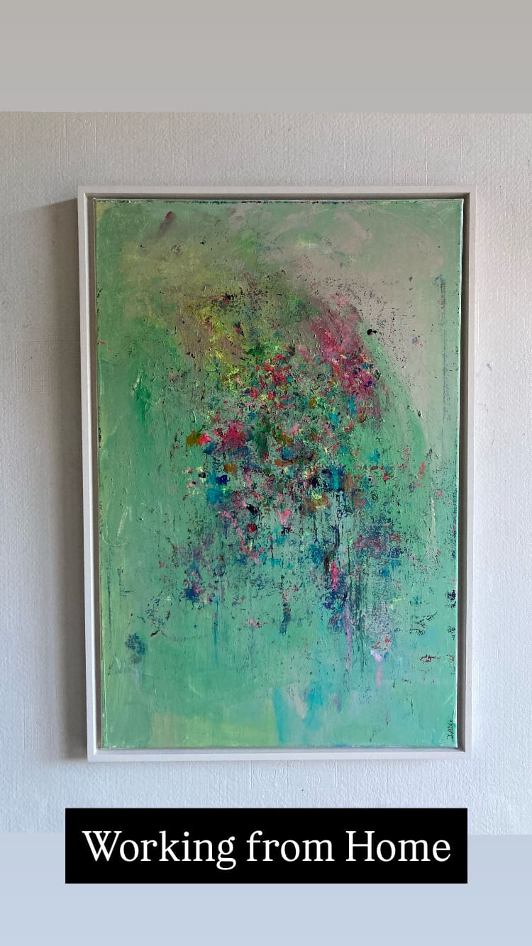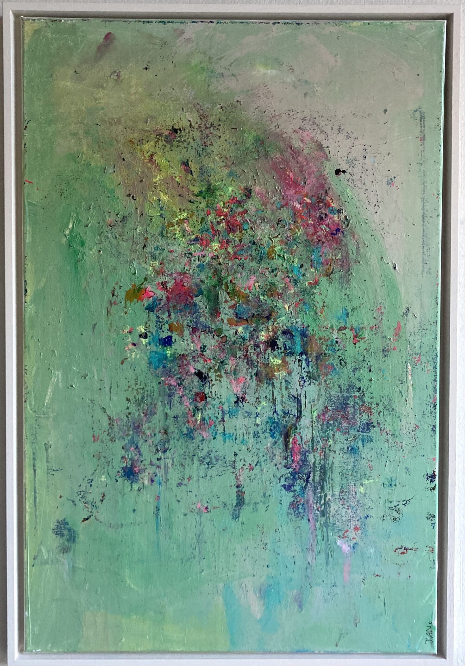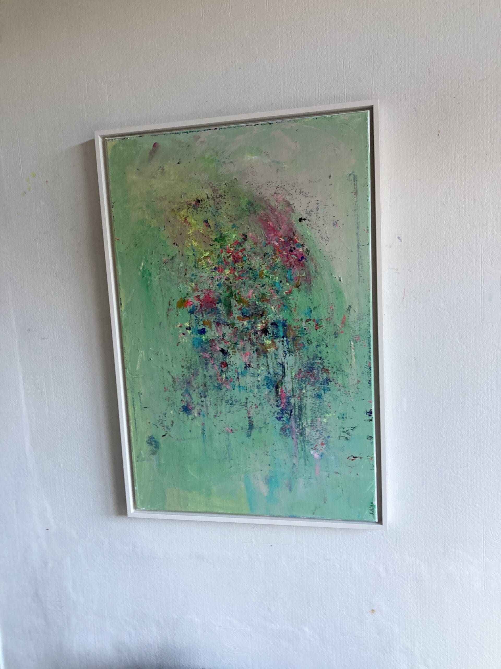 Original abstract artwork in Green with lots of bright colour pops – bright but not overbearing, perfect for a contemporary space. Framed in a white wooden L wooden frame.